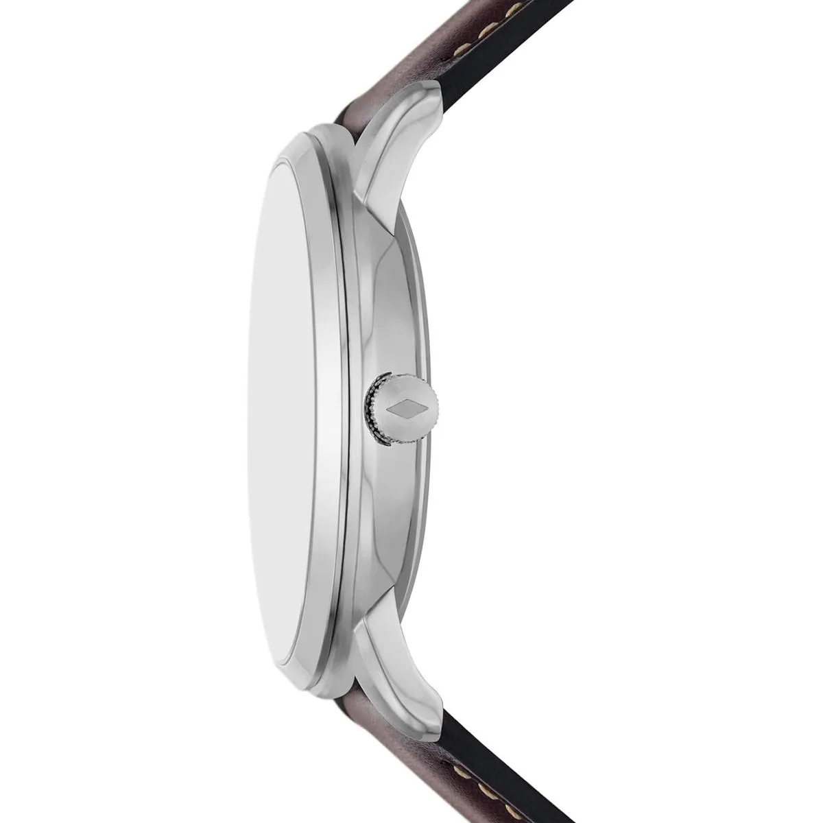 Caja de acero inoxidable con esfera plateada de rayos solares y apertura para disco gráfico de sol/luna; correa de cuero marrón con cierre de hebilla ajustable; intercambiable con todas las correas de reloj Fossil de 0.866 in