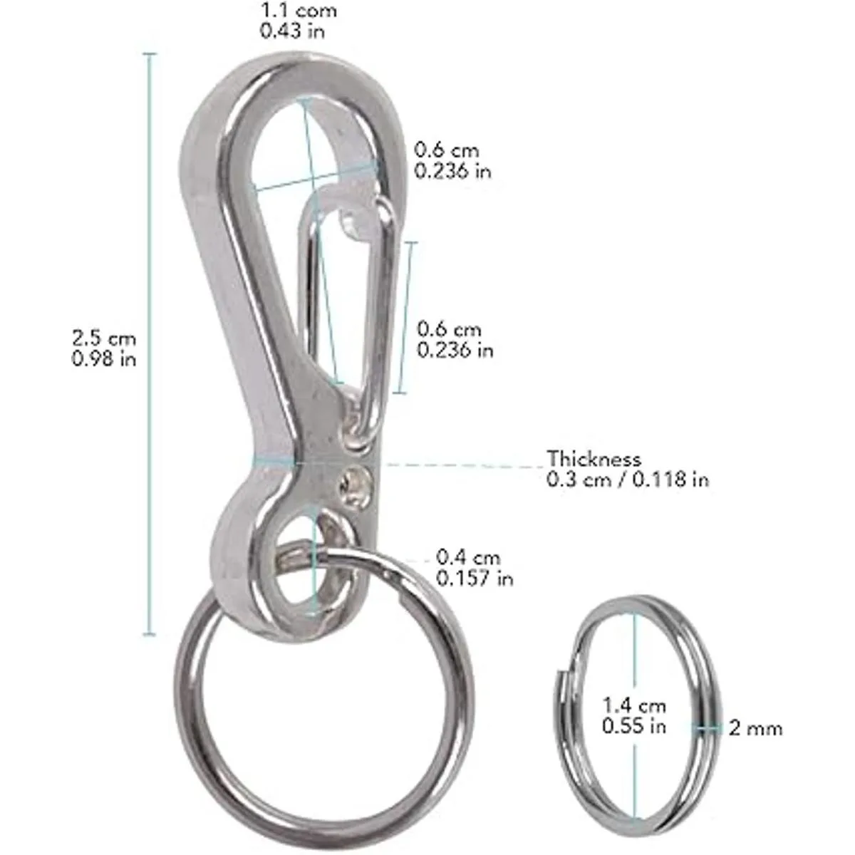 Viene en un juego: este producto viene con 2 clips 2 anillos por juego. Las dimensiones del clip de liberación rápida son 1.0 in x 0.4 in con un diámetro de 0.2 in. El ancho de apertura del anillo redondo de liberación rápida es de 0.118 in.
