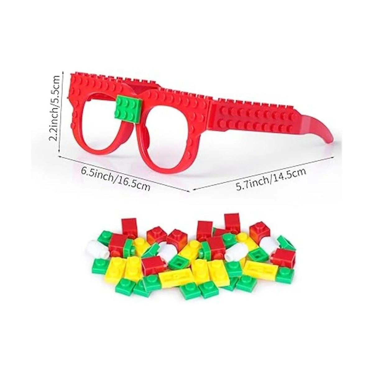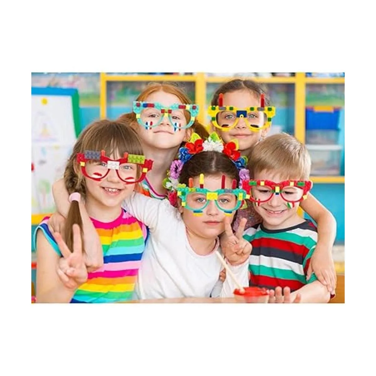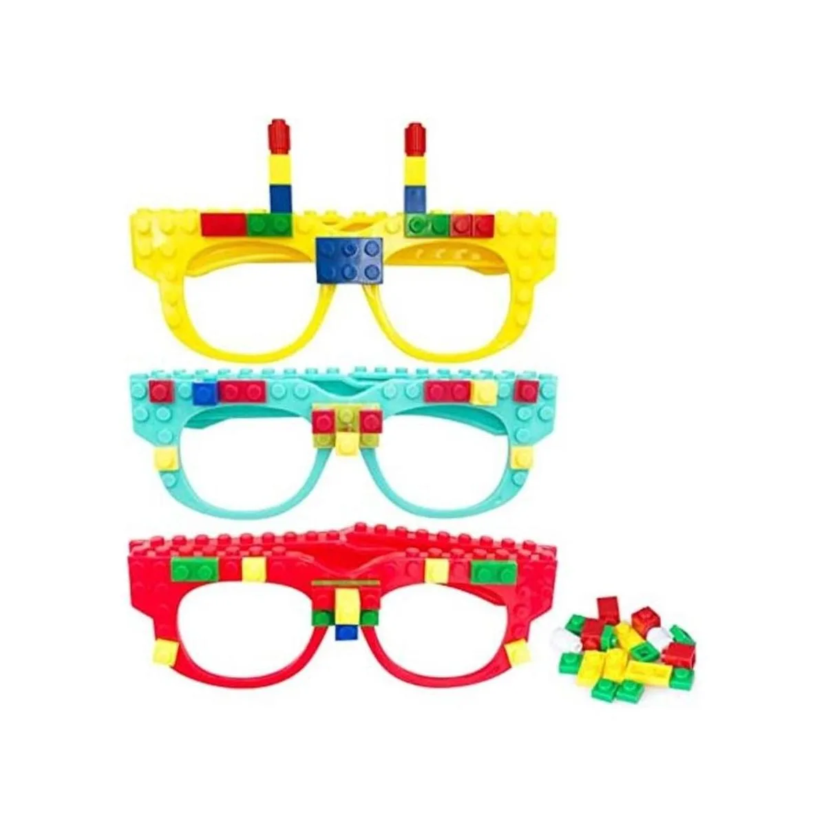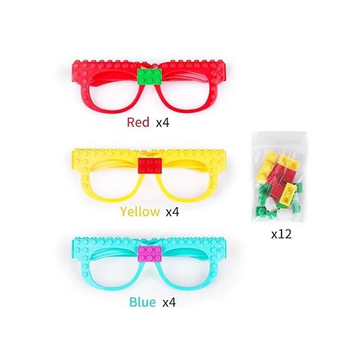 El paquete incluye: recibirás 12 marcos de gafas 4 rojos, 4 amarillos y 4 cianes, cada marco de gafas viene con un paquete de ladrillos de construcción de colores, los niños pueden crear su par único de gafas construyendo sobre ellos.