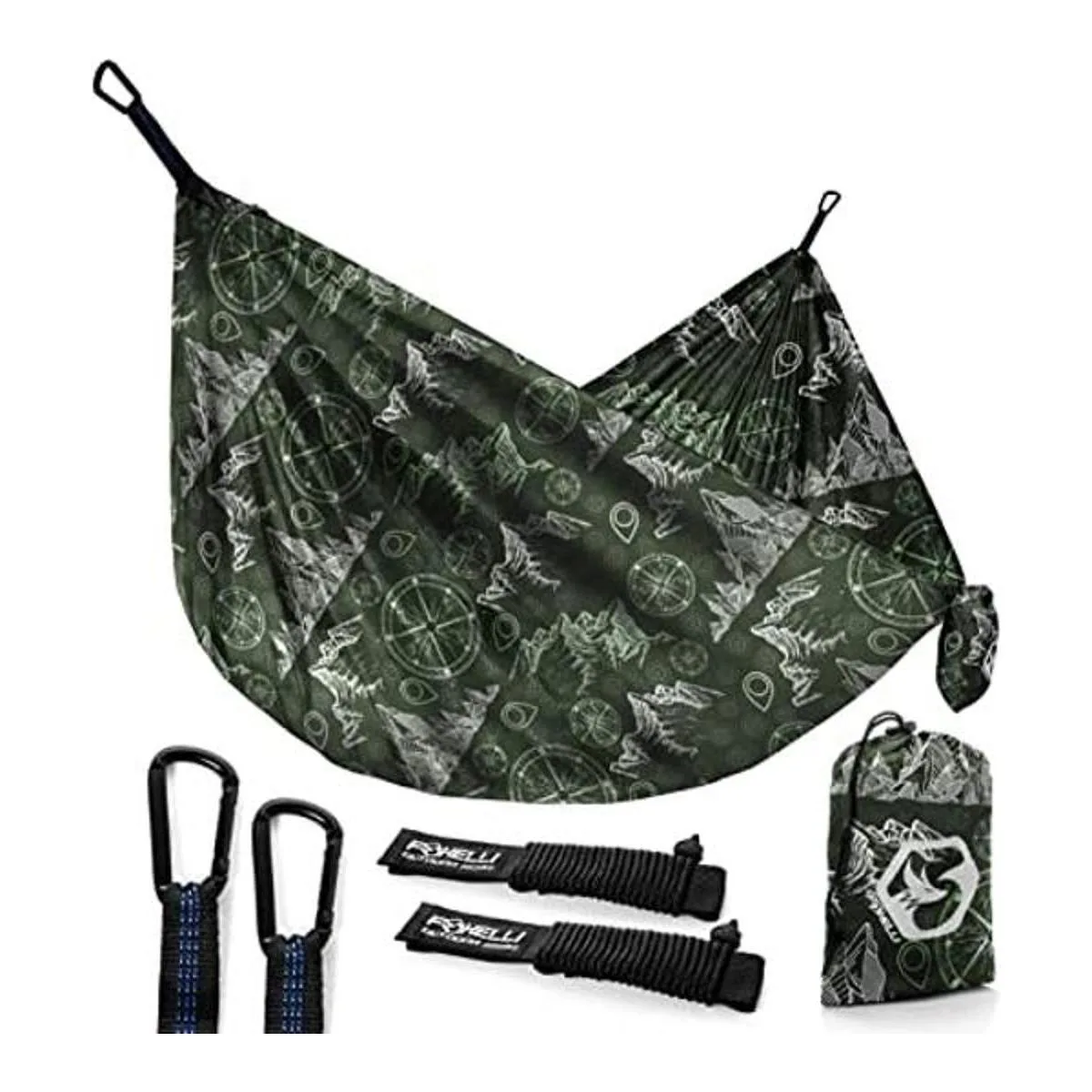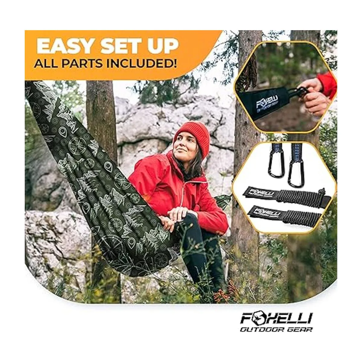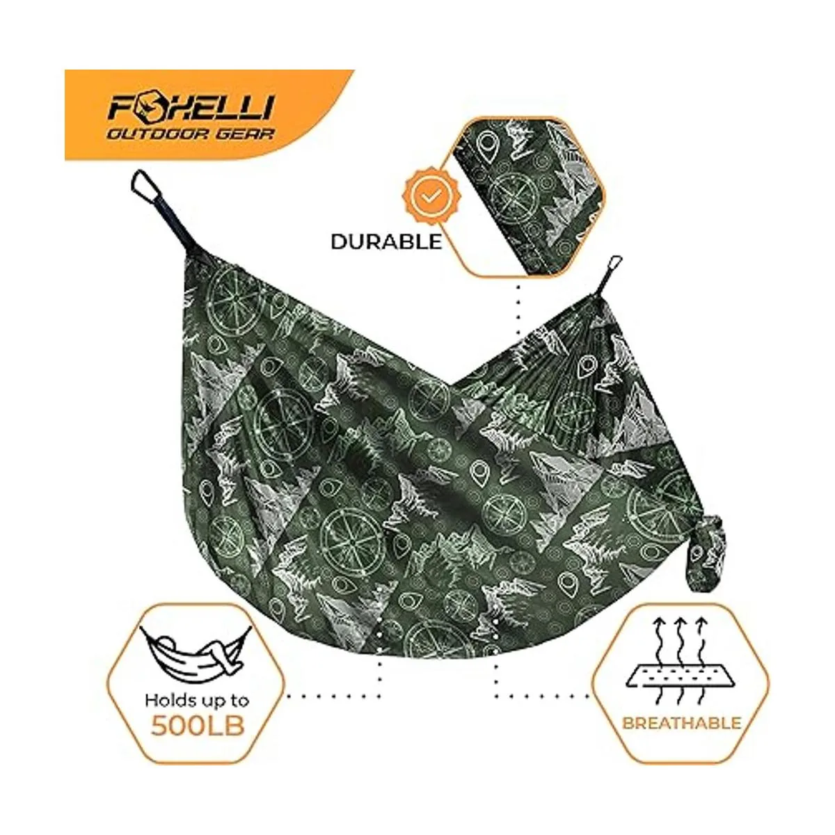 Foxelli Hamaca de camping Hamaca portátil de nailon ligero con cuerdas de árbol y mosquetones, perfecta para exteriores, mochileros, senderismo, camping, viajes, playa, patio trasero y jardín