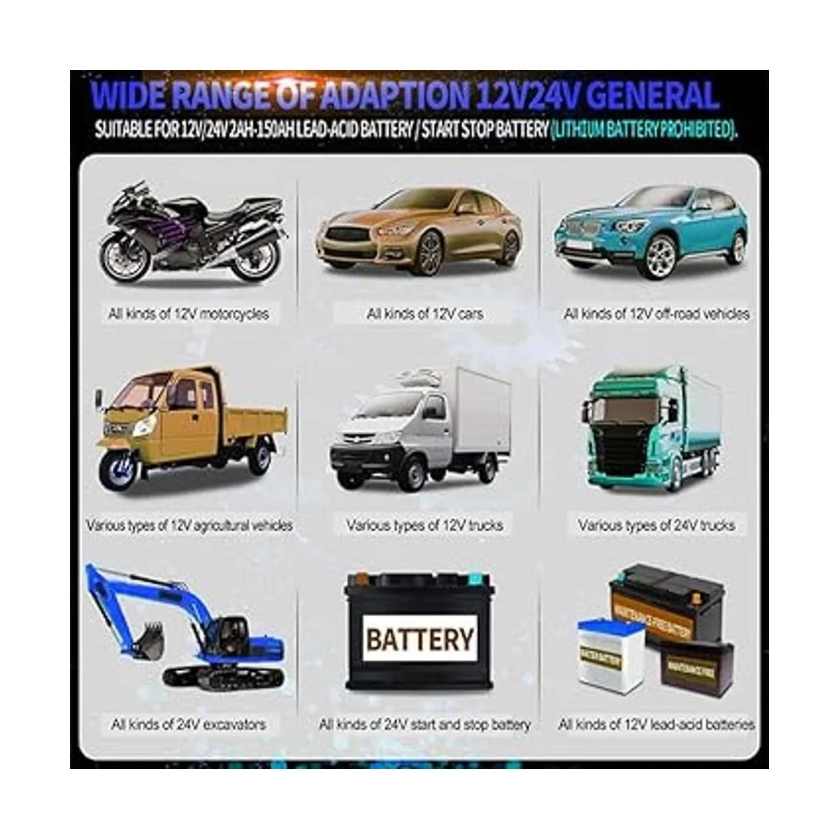 Amplia gama de aplicaciones Los cargadores de 3 etapas son adecuados para la mayoría de tipos de batería, incluyendo calcio, gel y AGM, baterías húmedas. También pueden ayudar a restaurar las baterías gastadas y sulfatadas. Para coche, camión, motocicleta, cortacésped, barco, RV, SUV, ATV y más.