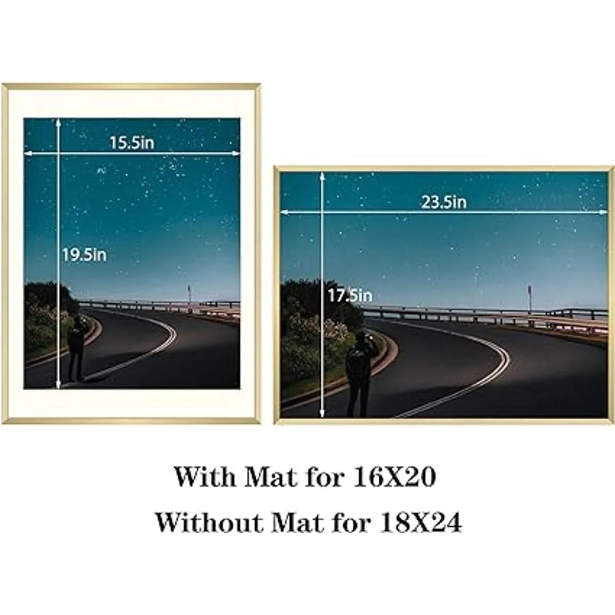 Tamaño del marco: tamaño de apertura interior de 15.5 x 19.5 pulgadas para fotos de 16 x 20 pulgadas con alfombrilla o póster de 18 x 24 pulgadas sin alfombrilla. Tamaño del marco exterior: 18.5 x 24.5 pulgadas.