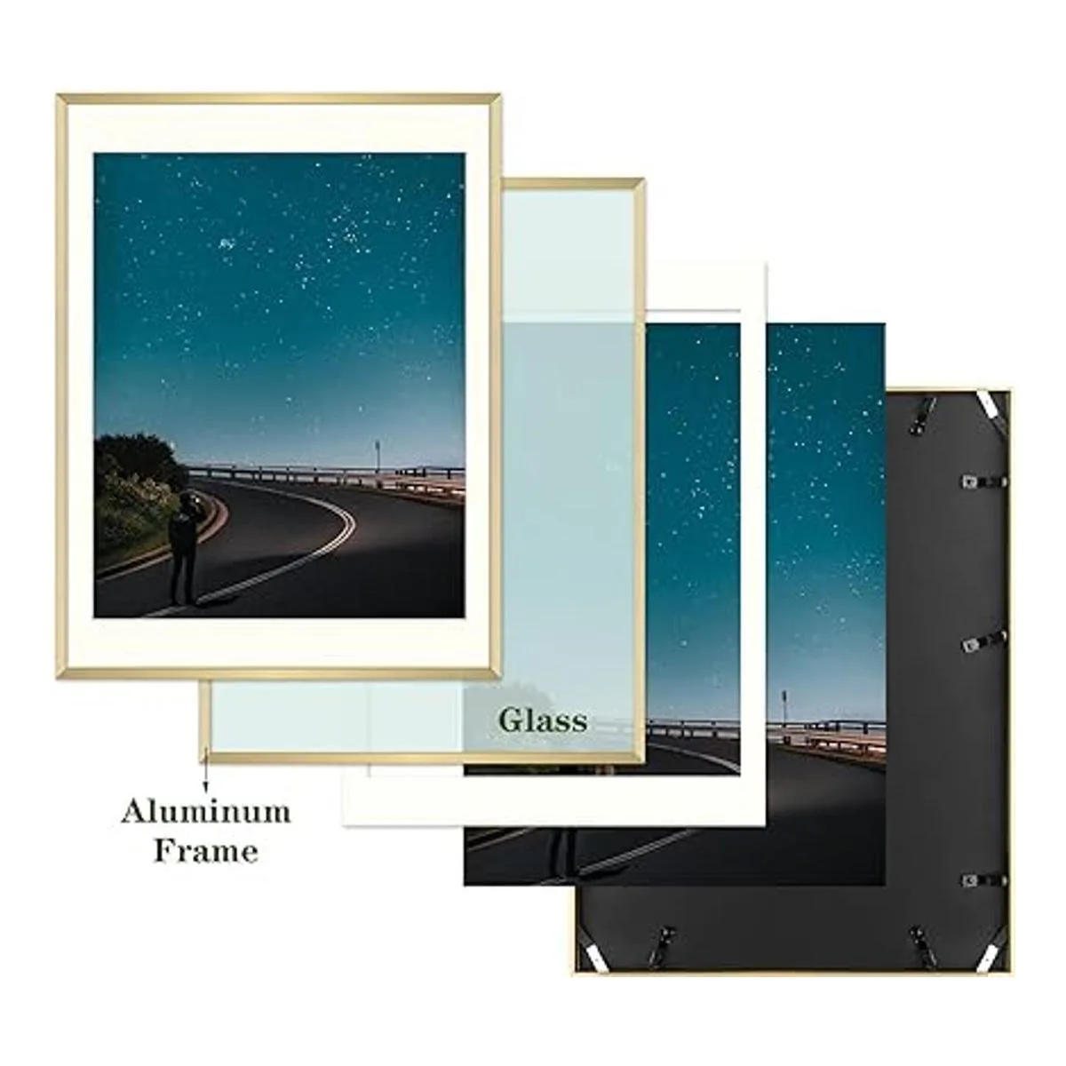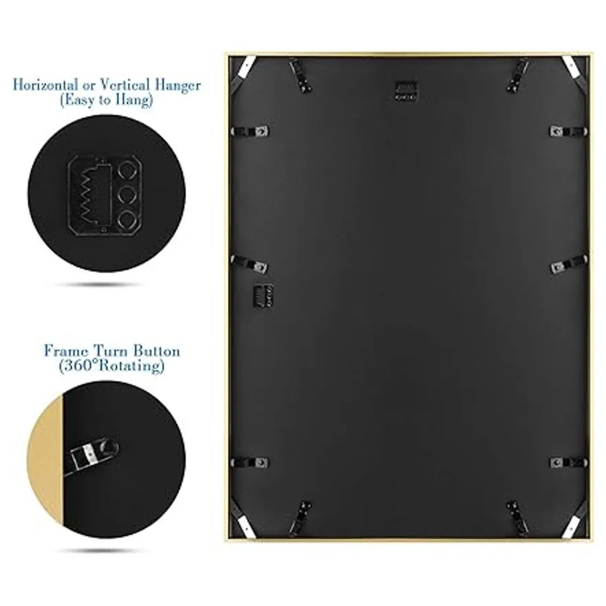 Estructura: ganchos resistentes de dientes de sierra en la parte posterior para exhibición vertical u horizontal. Los 4 clips de esquina sujetan bien la parte trasera para garantizar que tu arte enmarcado permanezca en su lugar de forma segura.