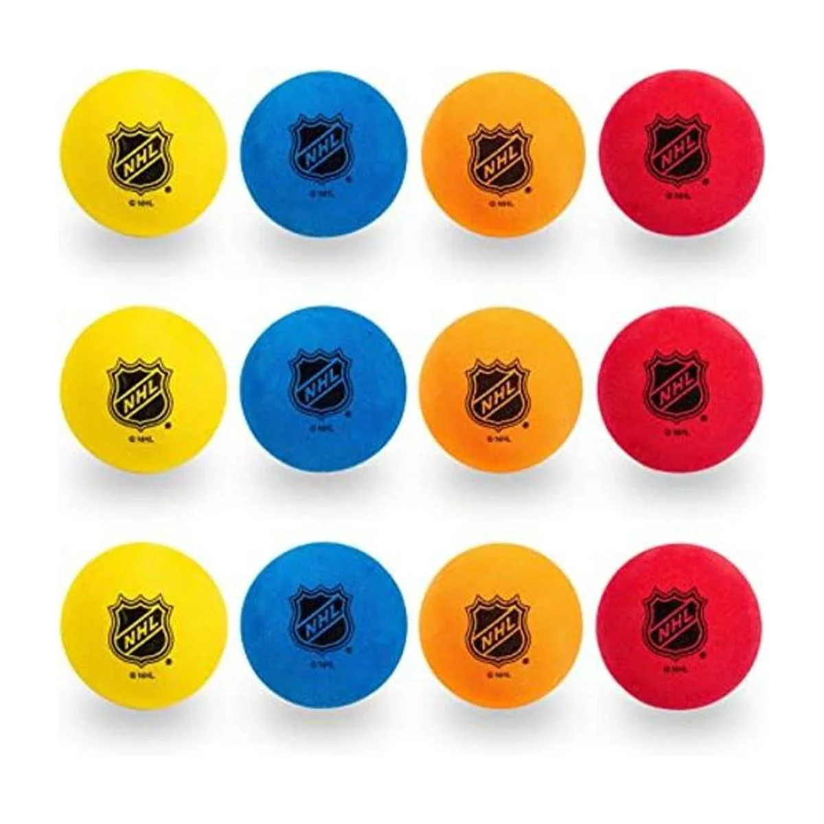 Franklin Sports Pelotas de hockey para la rodilla, mini bolas de hockey de espuma para interiores para niños, 12 bolas de hockey de espuma suave, colores surtidos, bolsa con cordón