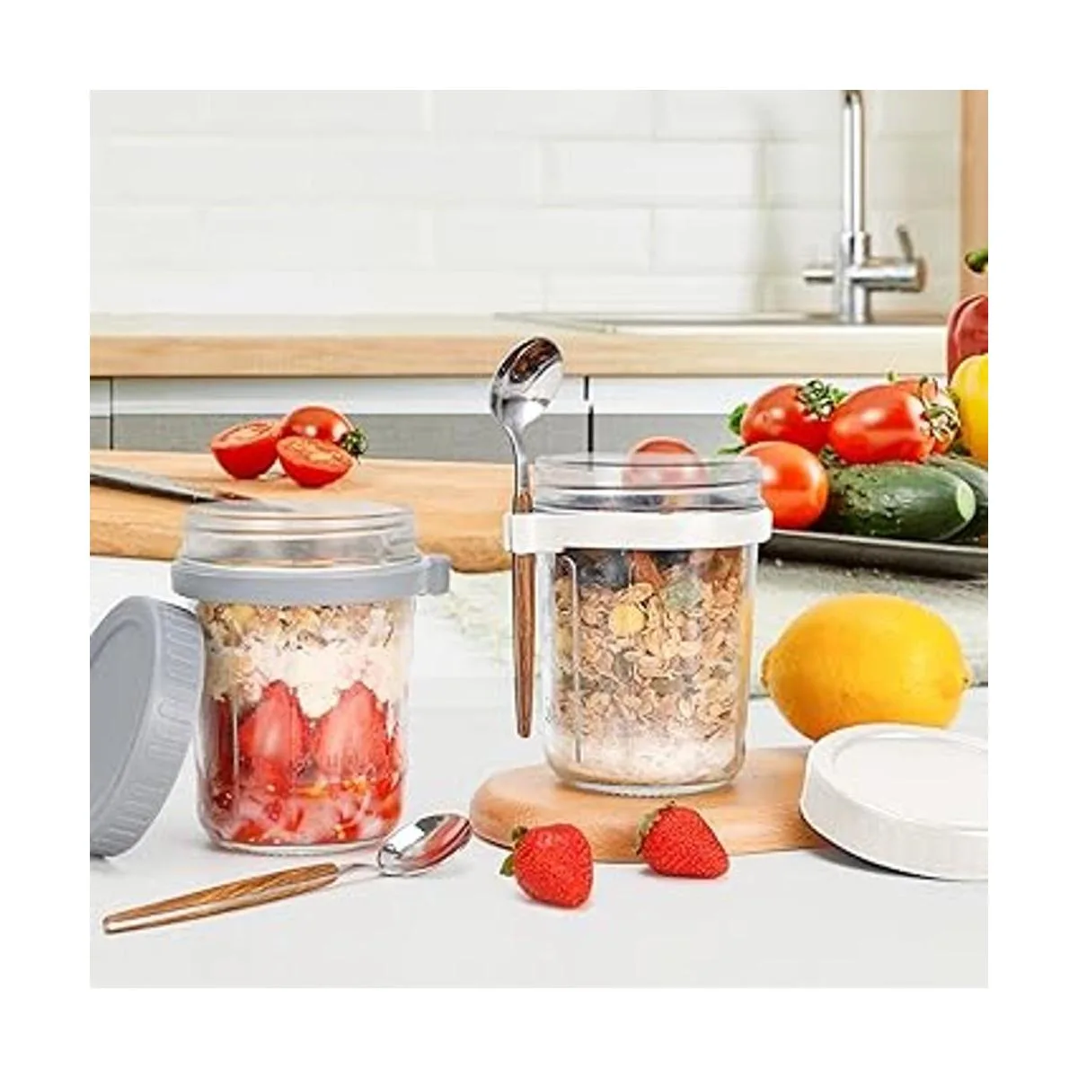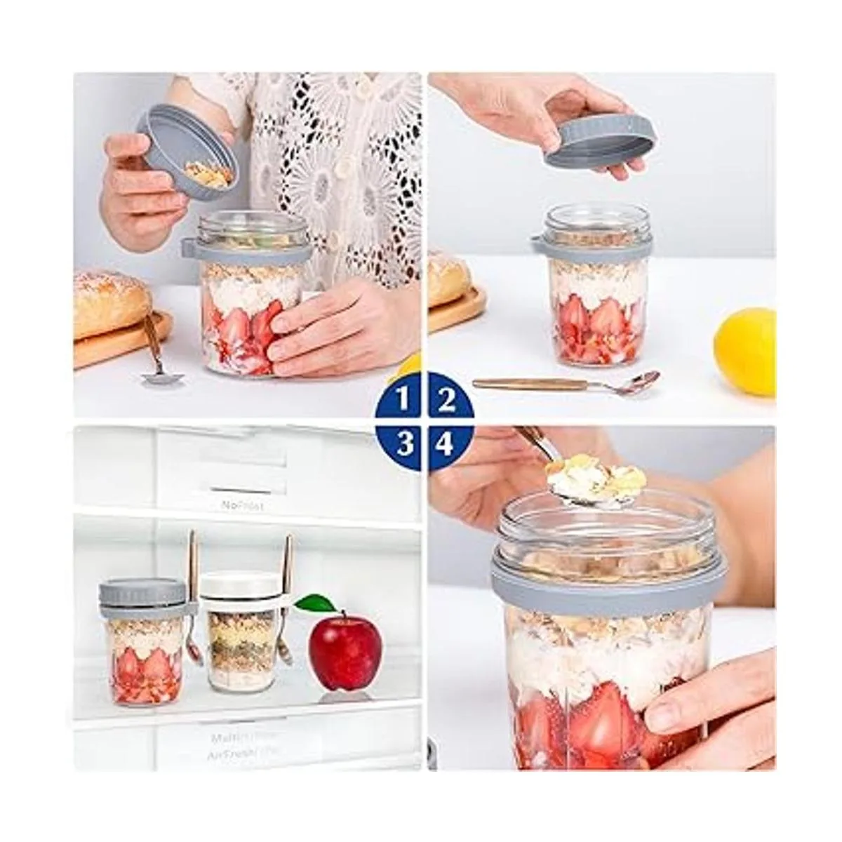 Frascos de avena con cuchara y tapa, 10 onzas paquete de 2, recipiente hermético de avena con marcas de medición, tarros Mason con tapa para cereales sobre la marcha gris y blanco