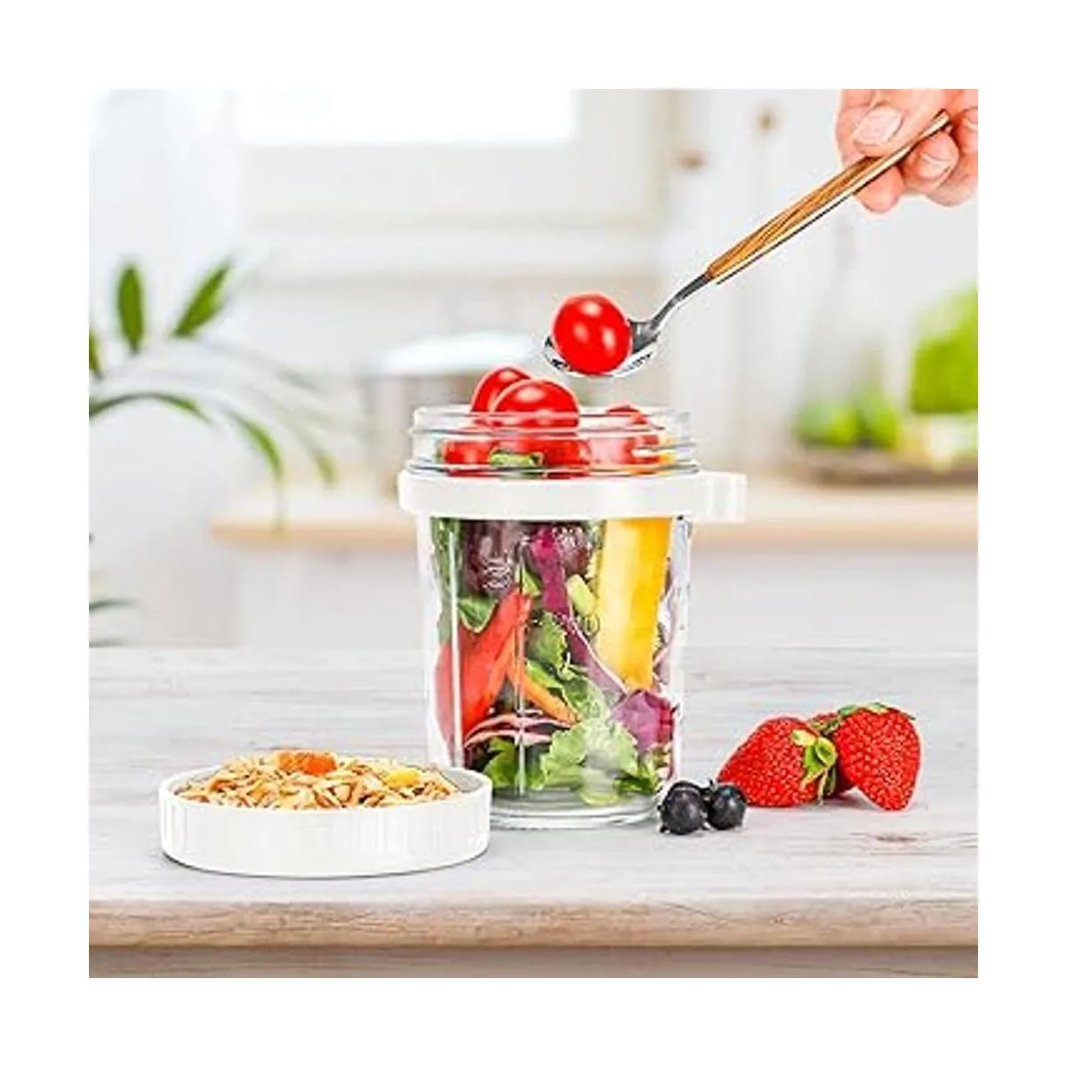 Ampliamente utilizado: tarro de albañil de 10 onzas con tapa y cuchara, perfecto para dietas para controlar la ingesta de alimentos, se puede utilizar para hacer avena durante la noche, almacenar granos, ensaladas, mermeladas, nueces, frutas enlatadas para mantener tu comida fresca durante mucho tiempo.