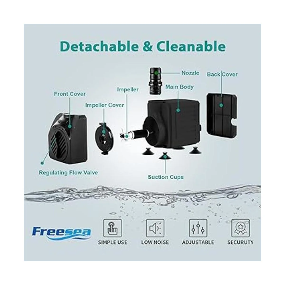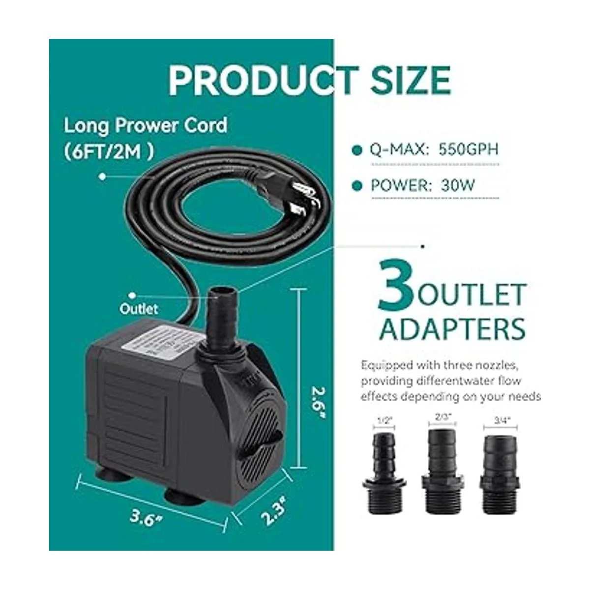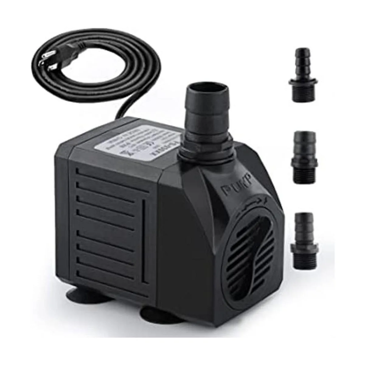Viene con 3 boquillas: voltaje CA 110120V/60Hz, la bomba de estanque de 30 vatios tiene 3 boquillas para elegir: 0.25/0.66/0.75. Proporciona un flujo de agua diferente como desees. Los accesorios roscados hacen que sea más estable. 4 potentes ventosas individuales ayudan a mantenerlo en su lugar, por lo que puedes pegarlo en el lado derecho del acuario, ya sea vertical u horizontalmente