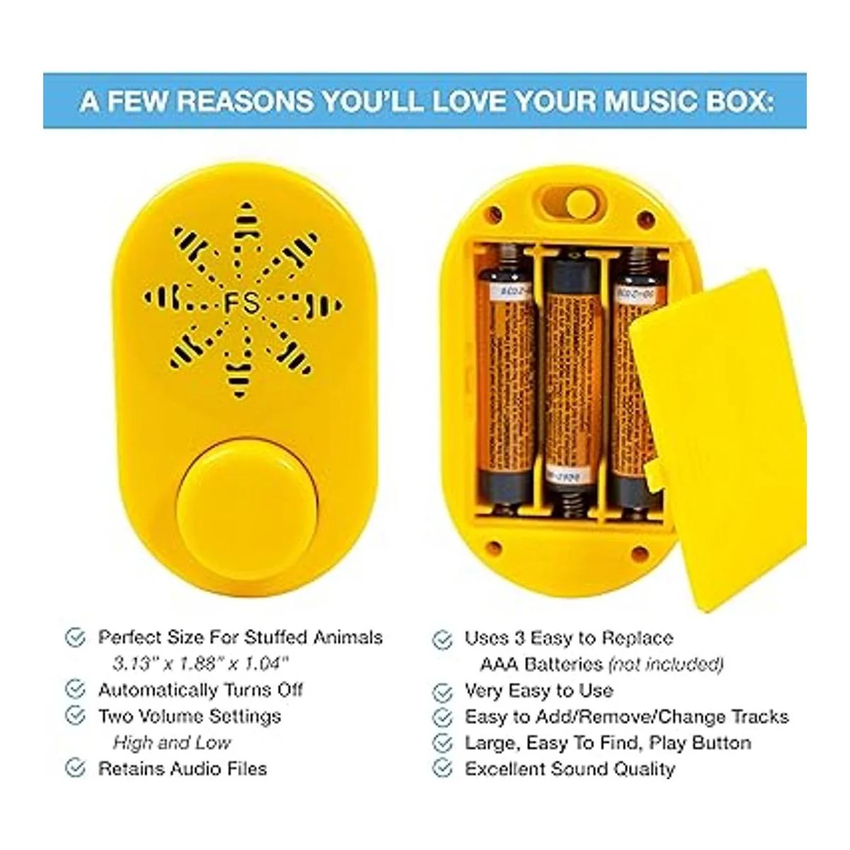 El tamaño perfecto Este módulo de grabadora de sonido mágico tiene el tamaño adecuado para caber en la parte posterior de un animal de peluche favorito. O funciona muy bien para colocar en la parte posterior de un póster para un mensaje especial de cumpleaños, anuncio o proyecto de feria científica. Esta caja de grabadora de voz amarilla de 2 horas para animales de peluche mide solo 3.1 x 1.9 x 1.04 pulgadas de tamaño y tiene bordes redondeados para mayor seguridad y comodidad.