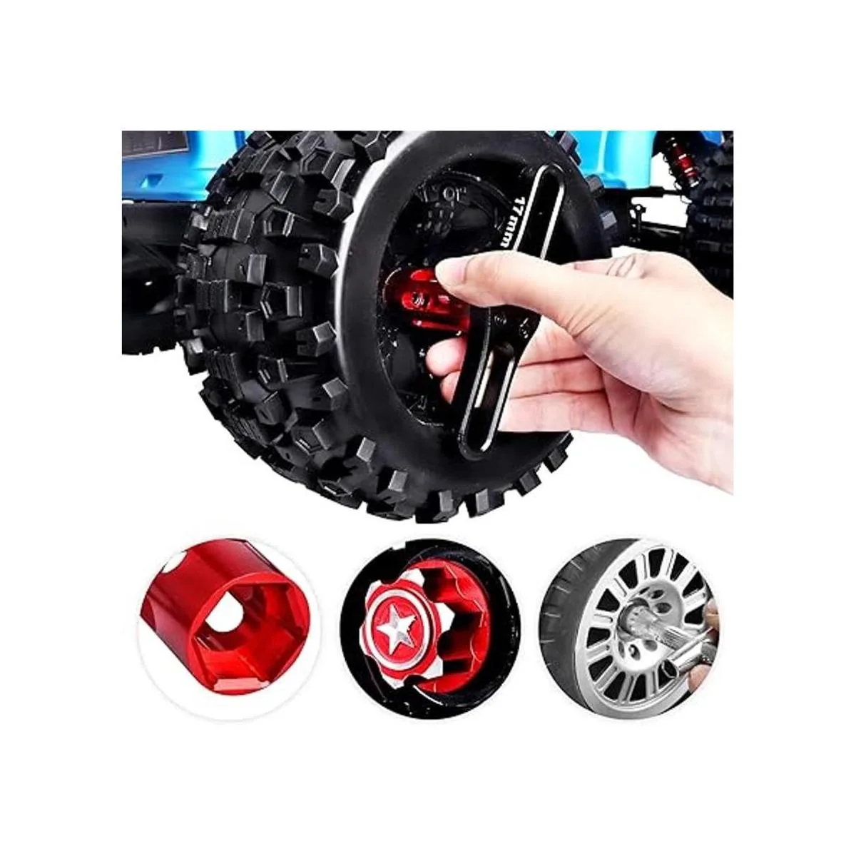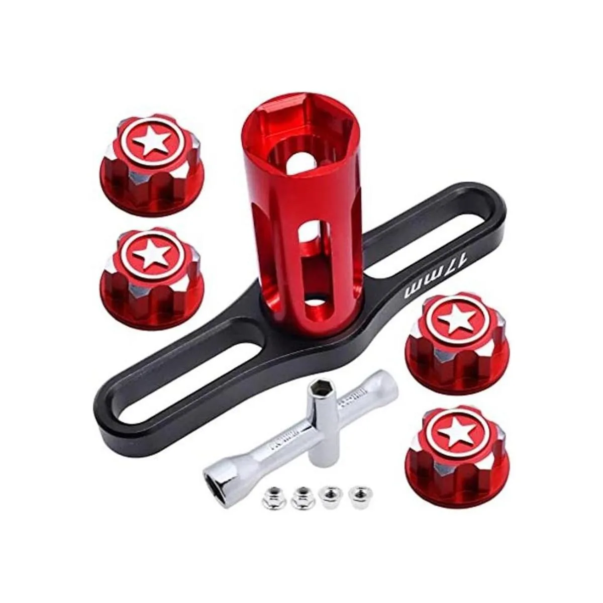Gran valor, recibirás 4 tuercas hexagonales de 0.669 in, 1 llave de rueda de 0.669 in, 4 tuercas de bloqueo de 0.157 in, 1 llave hexagonal pequeña de 4 vías, ideal para modelos de coche RC