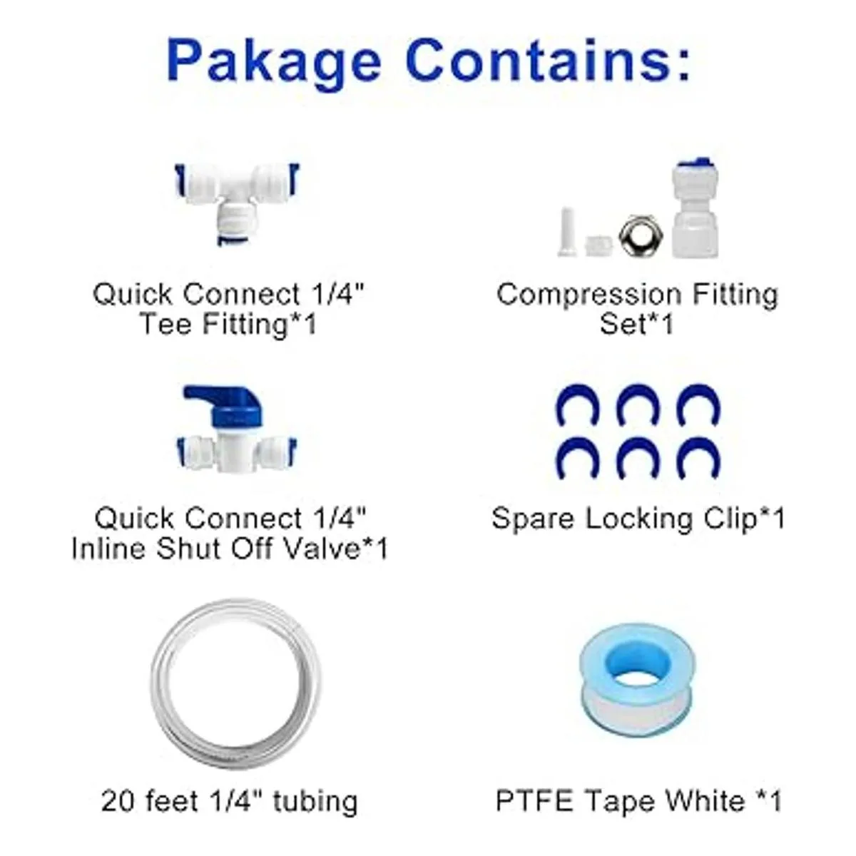El paquete incluye un tubo de 24.9 ft y una válvula de 0.2 in x 0.2 in x 0.2 in en T, una válvula de cierre en línea de 0.2 in x 0.2 in, un juego de ajuste de compresión.