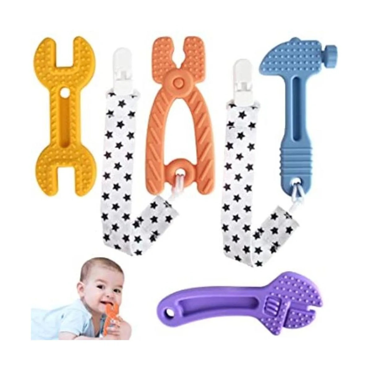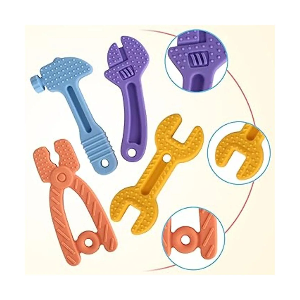Fu Store Paquete de 4 juguetes de dentición de silicona suave para niños pequeños, llave de martillo para bebés, herramientas de alicates con forma de mordedores de bebé, alivio de calmar el juego de encías de bebés juego de martillo