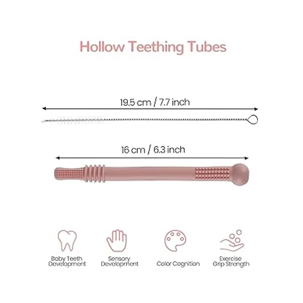 Paquete de 6 hermosos colores: recibirás 6 mordedores huecos diferentes en diferentes colores y 1 cepillo de tubo.