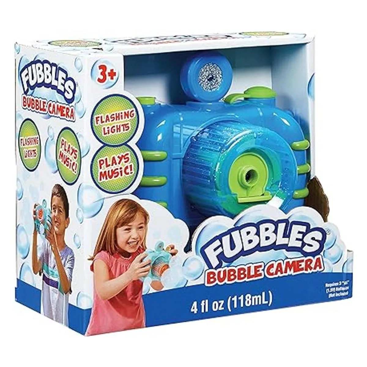 Este juego incluye la cámara Fubbles Bubble en azul con música y luces y nuestra solución de burbujas no tóxicas Premium Fubbles. Funciona con 4 pilas AA, no incluidas.