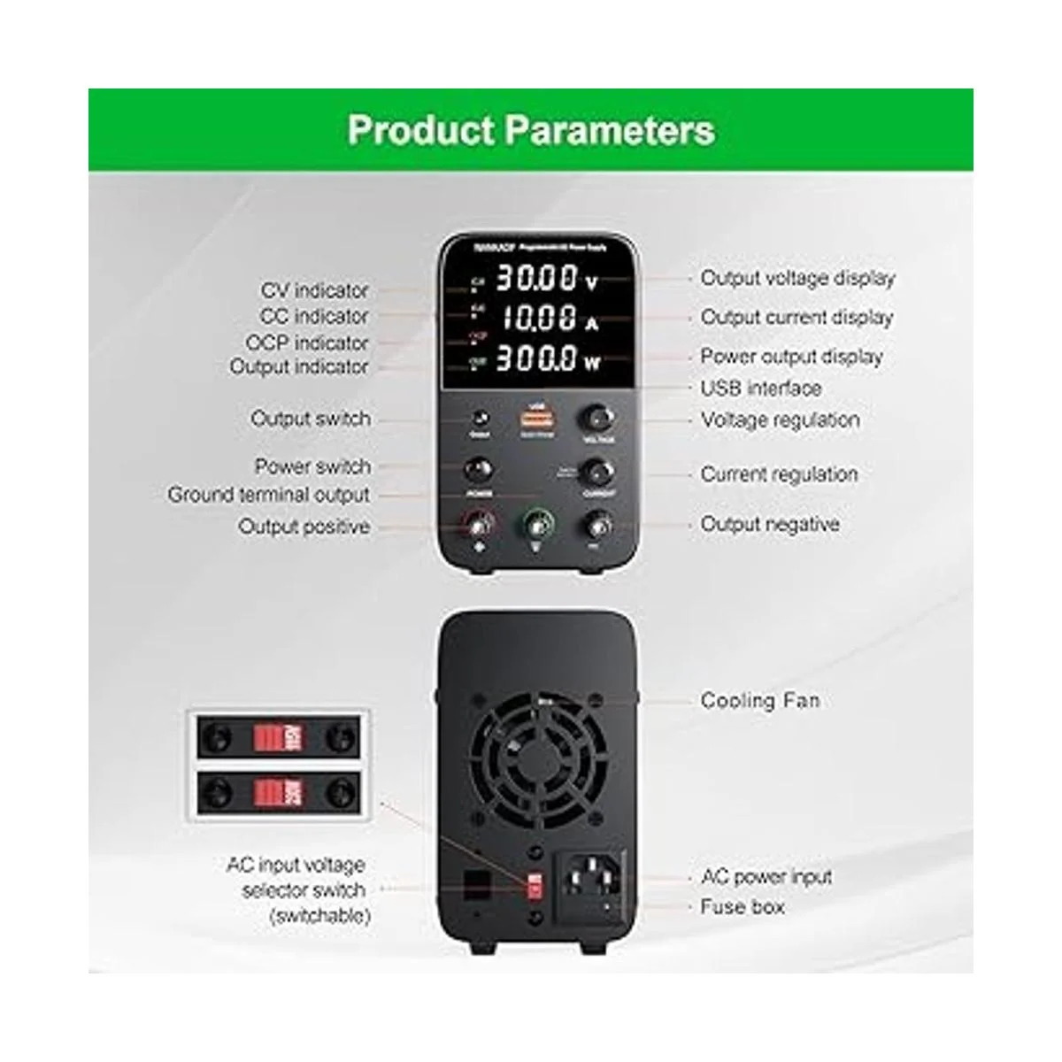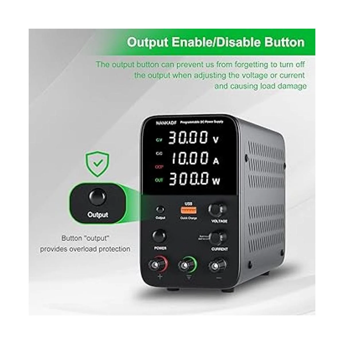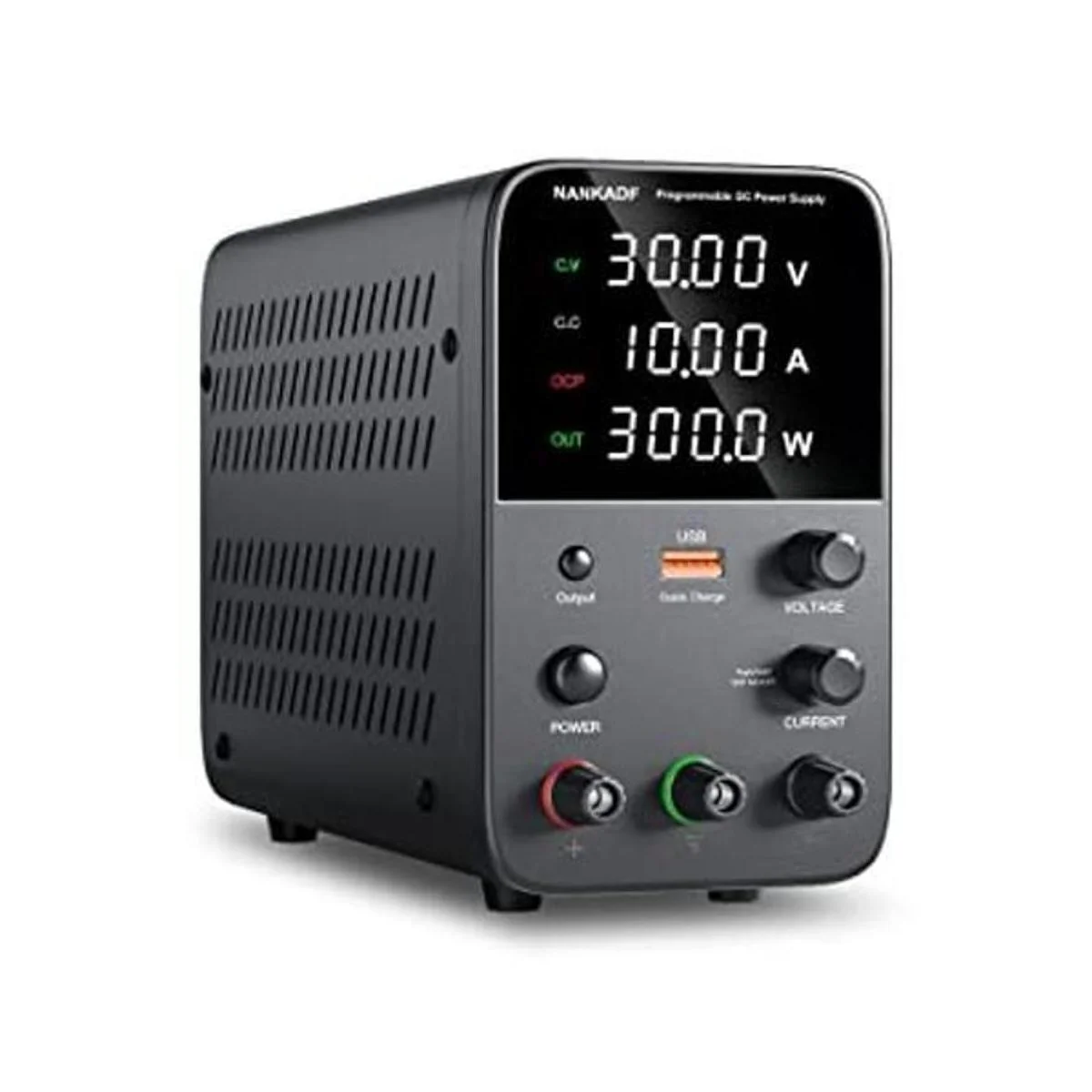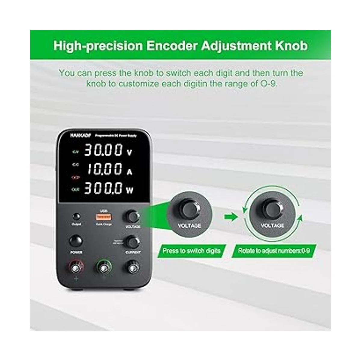 Fuente de alimentación CC variable, fuente de alimentación de banco de 30 V 10 A con pantalla LED de 4 dígitos, carga rápida USB de 5 V3.6 A, fuente de alimentación de conmutación ajustable con perilla de ajuste de codificador, botón de activacióndesactivación de salida
