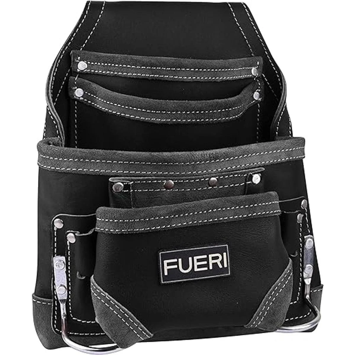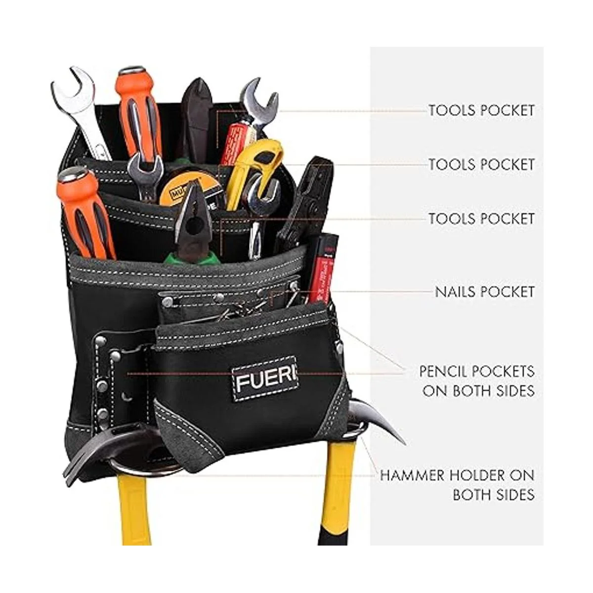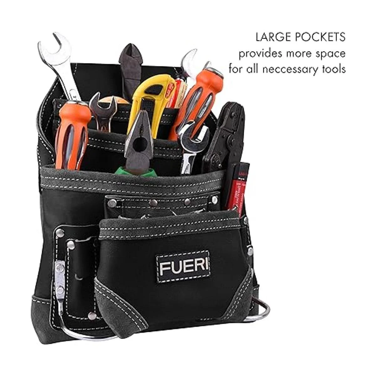 FUERI Bolsa de herramientas de cuero negro para carpinteros, 10 bolsillos, kit de bolsa de herramientas para cinturón Herramienta organizadora de refuerzo remachada de cuero de grano de alta calidad Organizador de herramientas de mantenimiento de construcción