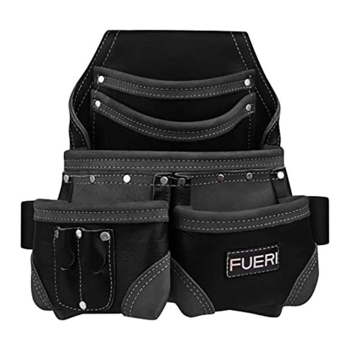 FUERI Bolsa de herramientas de cuero para carpinteros, 5 bolsillos, kit de bolsa de herramientas para cinturón, soporte de herramientas resistente con 2 bolsillos frontales para lápices, organizador de herramientas remachadas para plataforma, costuras reforzadas