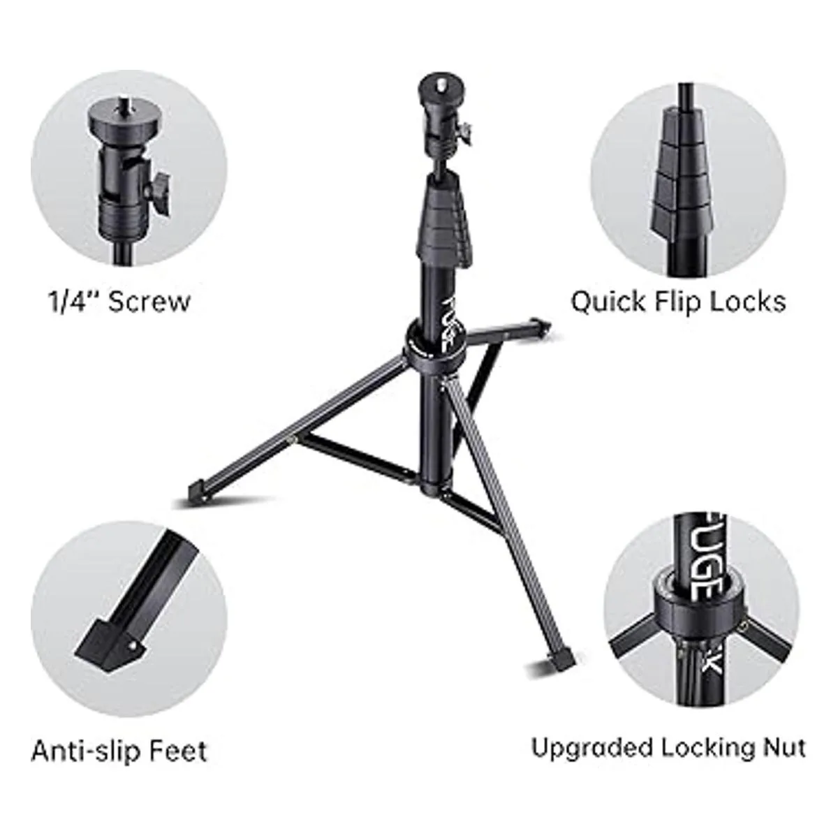Longitud del trípode extensible a 67 pulgadas: 67 pulgadas es extensión de trípode alto industrial. Superior a los trípodes estándar de 60 pulgadas. Cerraduras de clic fáciles para un uso rápido y fiable. Mango y pies de goma antideslizantes.