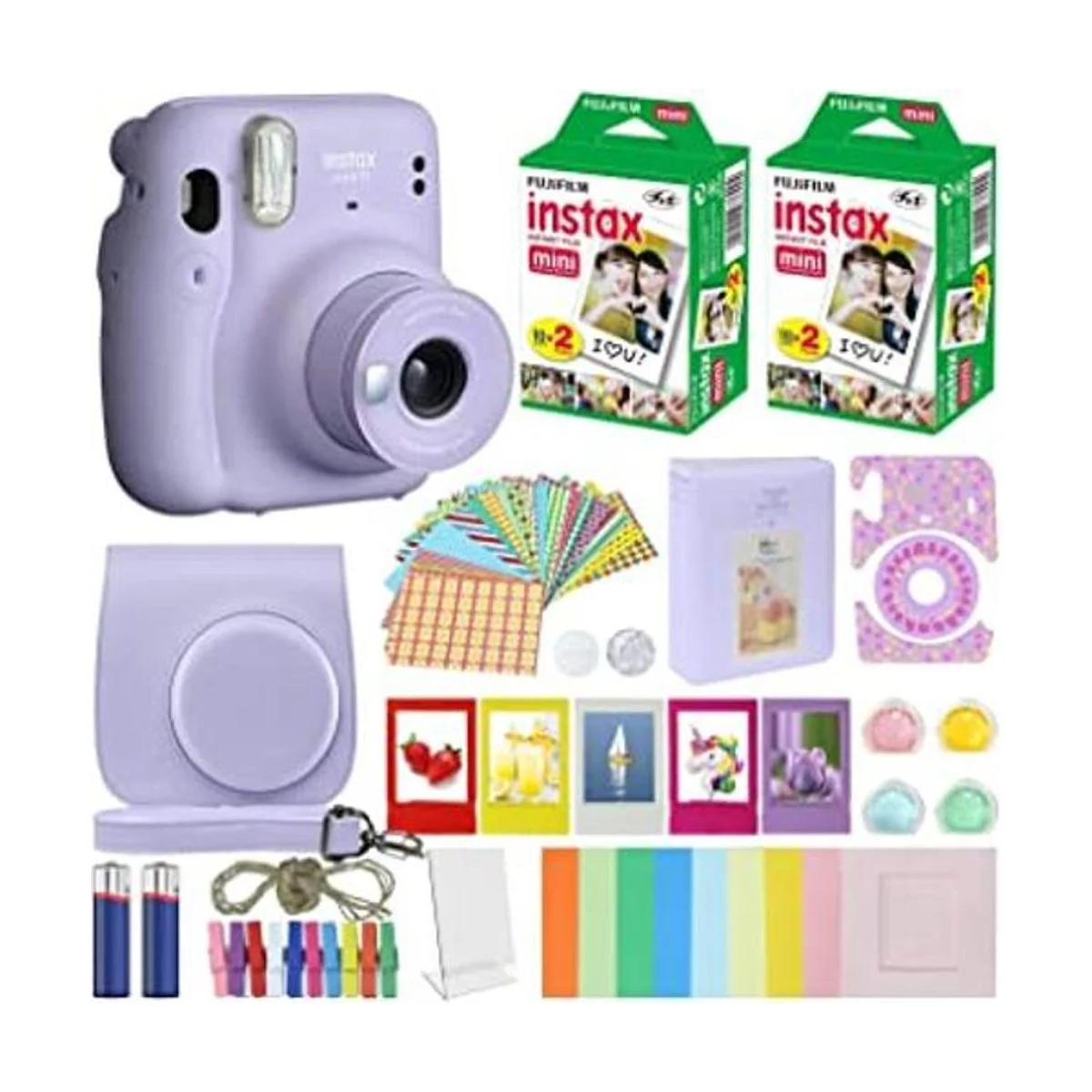 Fujifilm Instax Mini 11 Cámara instantánea + paquete de accesorios MiniMate + paquete económico de película Fuji Instax (40 hojas), paquete de accesorios, filtros de color, álbum, marcos (morado lila, embalaje estándar)