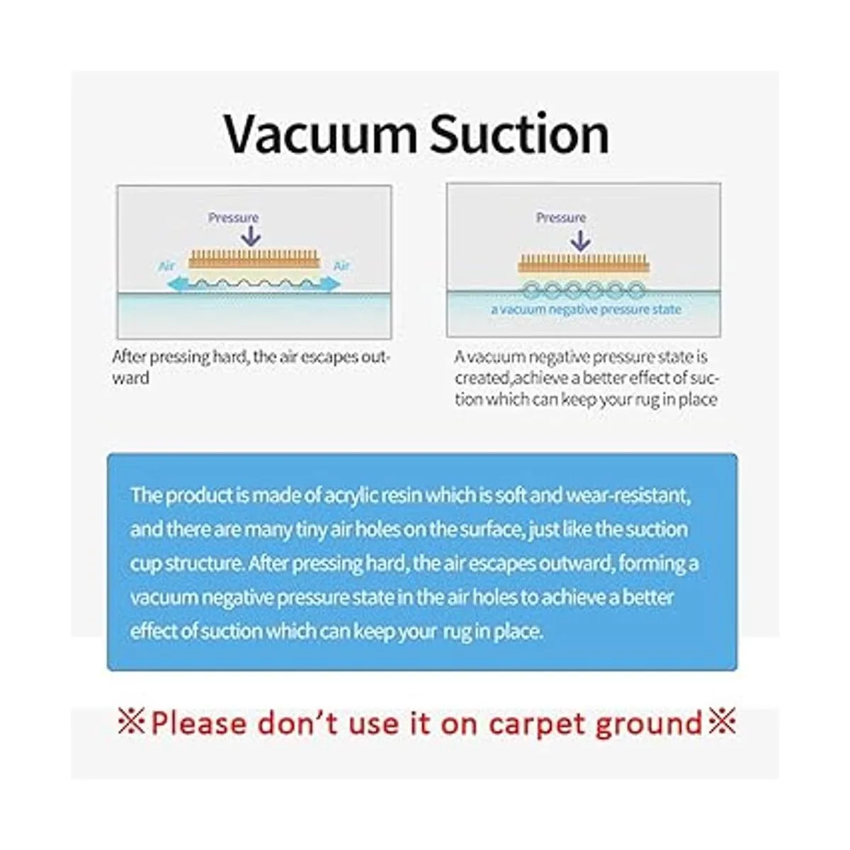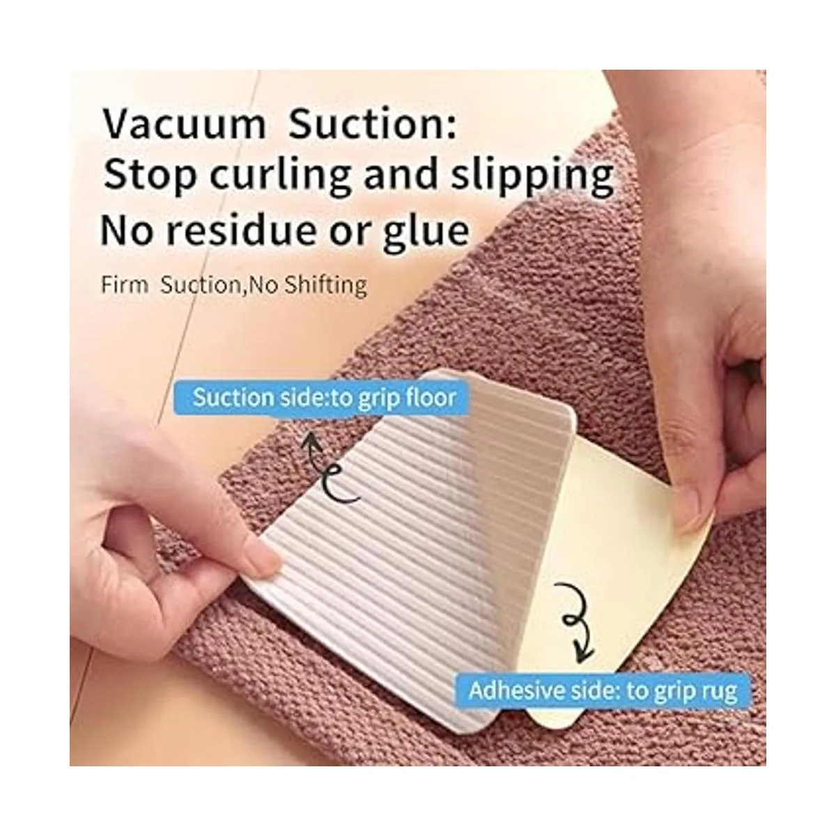 Fácil de instalar y despegar, sin residuos ni pegamento. Retira la calcomanía trasera y pega el agarre de la alfombra en la alfombra, luego presiona el agarre de la alfombra firmemente en el suelo. La tecnología única de vacío hace que se despegue fácilmente del suelo cuando lo necesites, sin dañar tu suelo.