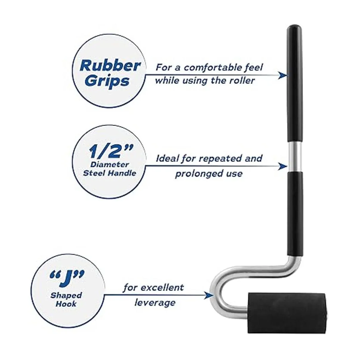 El mango de acero resistente está diseñado para ayudarte a ejercer tanta presión como sea posible en la superficie de trabajo. El mango está envuelto con dos secciones separadas de cómodos agarres de goma para un uso prolongado y menos fatiga de la mano. La parte inferior del mango forma la J para fijar el rodillo de goma resistente sin interponerse en el camino de tu proceso de rodamiento.