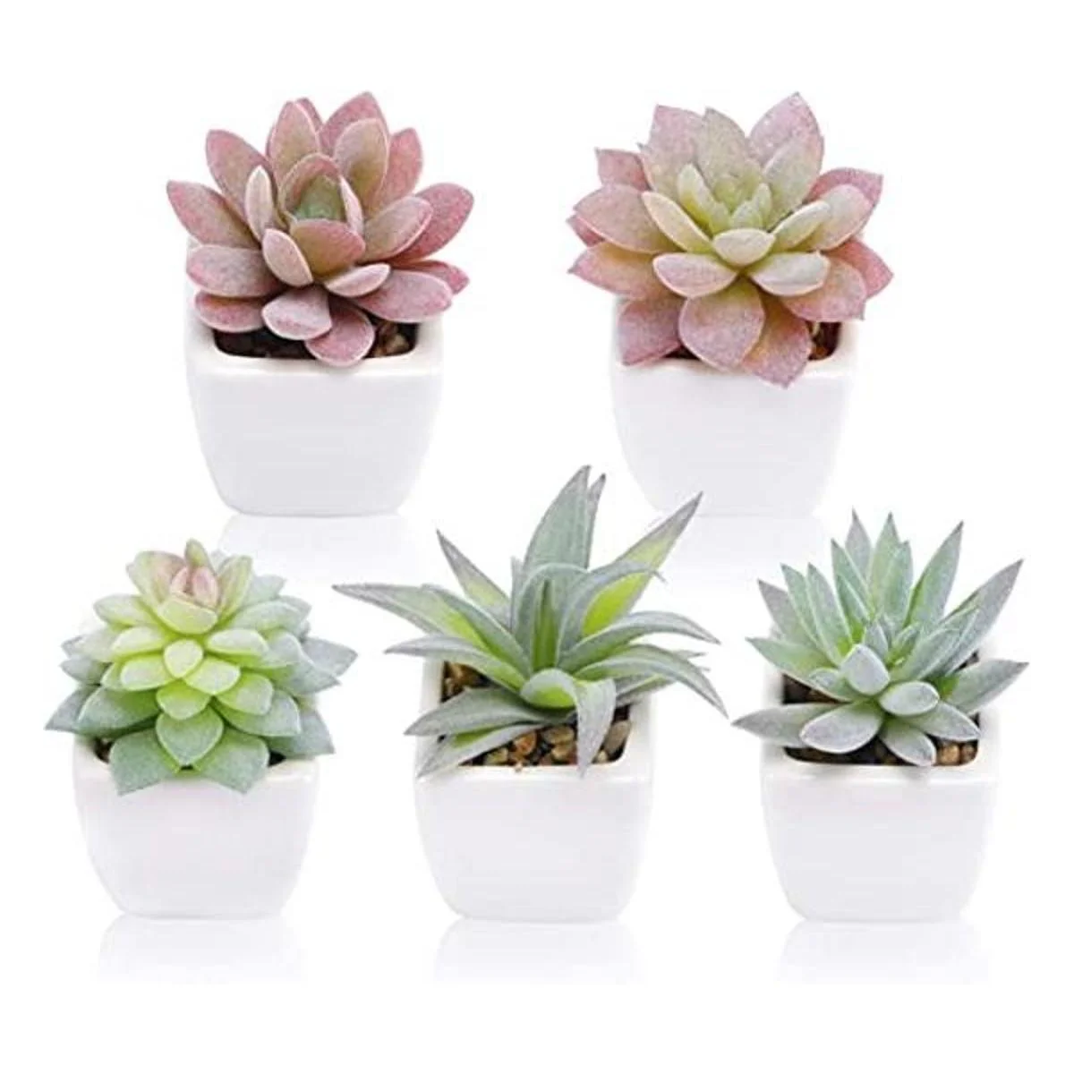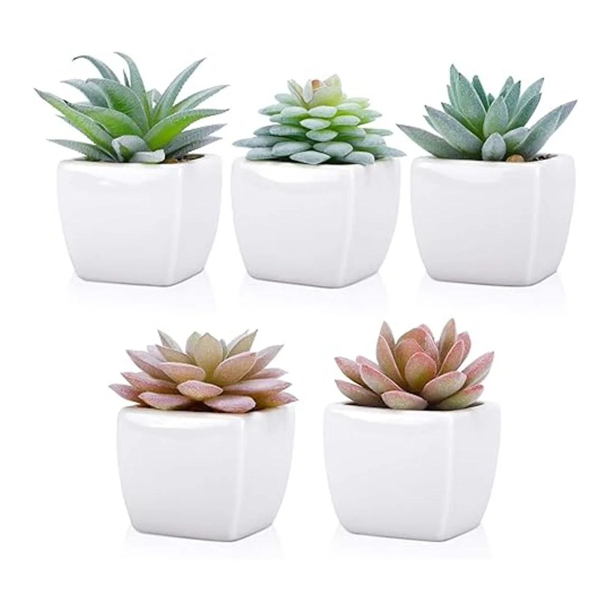 Juego de 5 miniplantas suculentas artificiales en macetas de cerámica blanca.