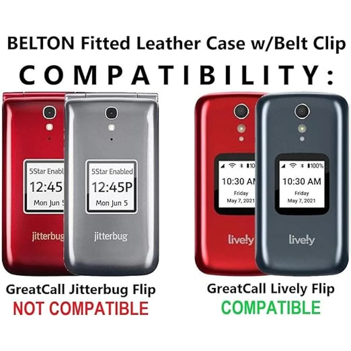Funda de piel auténtica Beltron diseñada y diseñada para ser compatible con el teléfono GreatCall Lively Flip para personas mayores. Ten en cuenta que esta funda está fabricada con piel de vaca auténtica de primera calidad, y el ajuste inicial puede ser ajustado. Sin embargo, poco después del uso inicial, la piel se estirará naturalmente en su lugar para un ajuste perfecto y cómodo. color negro. Verifica el modelo de tu teléfono antes de comprar, no es compatible con Jitterbug Flip.