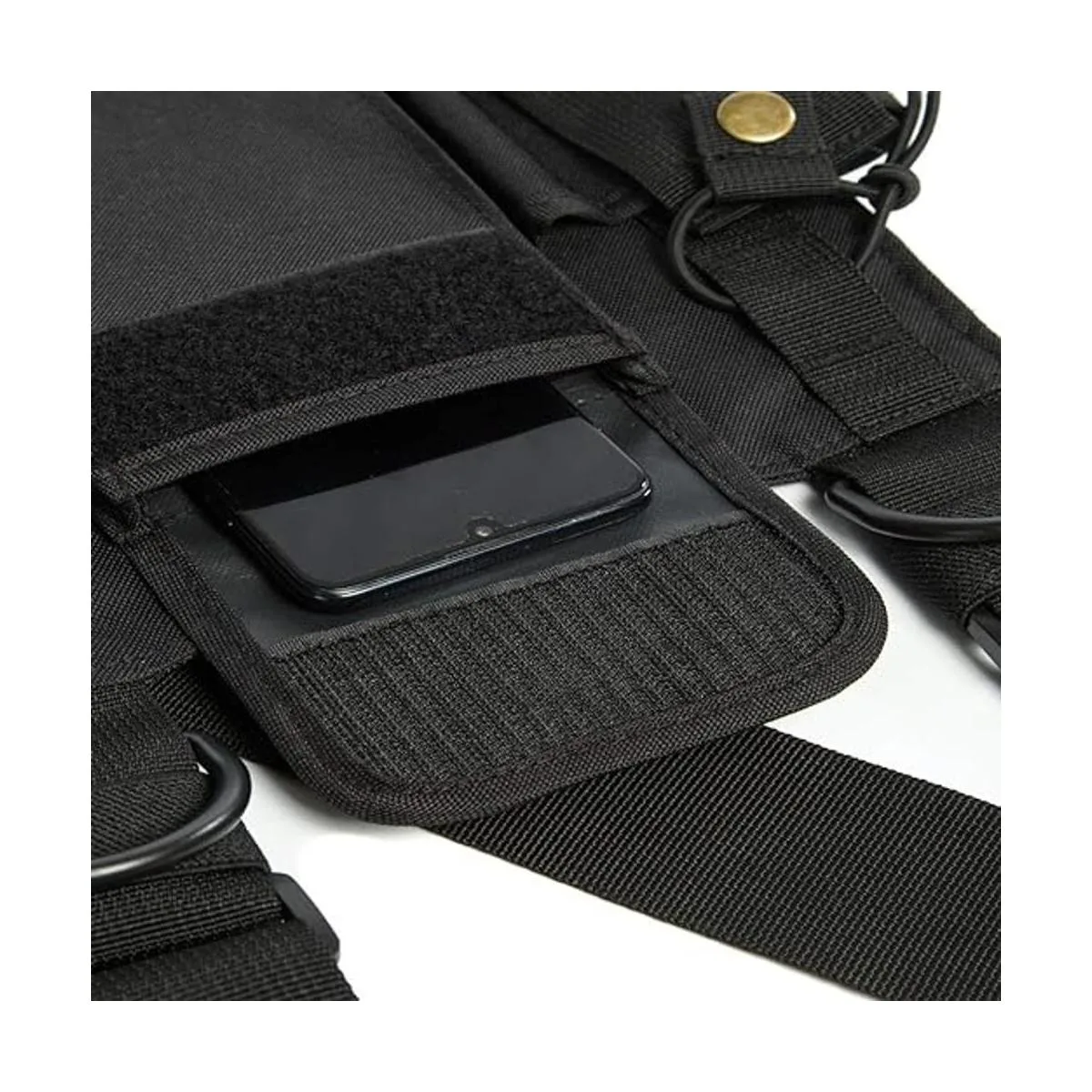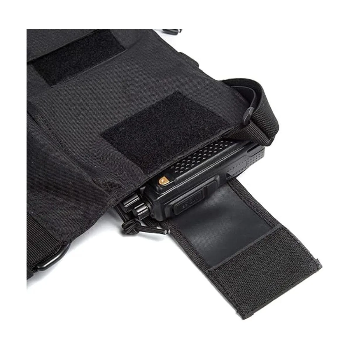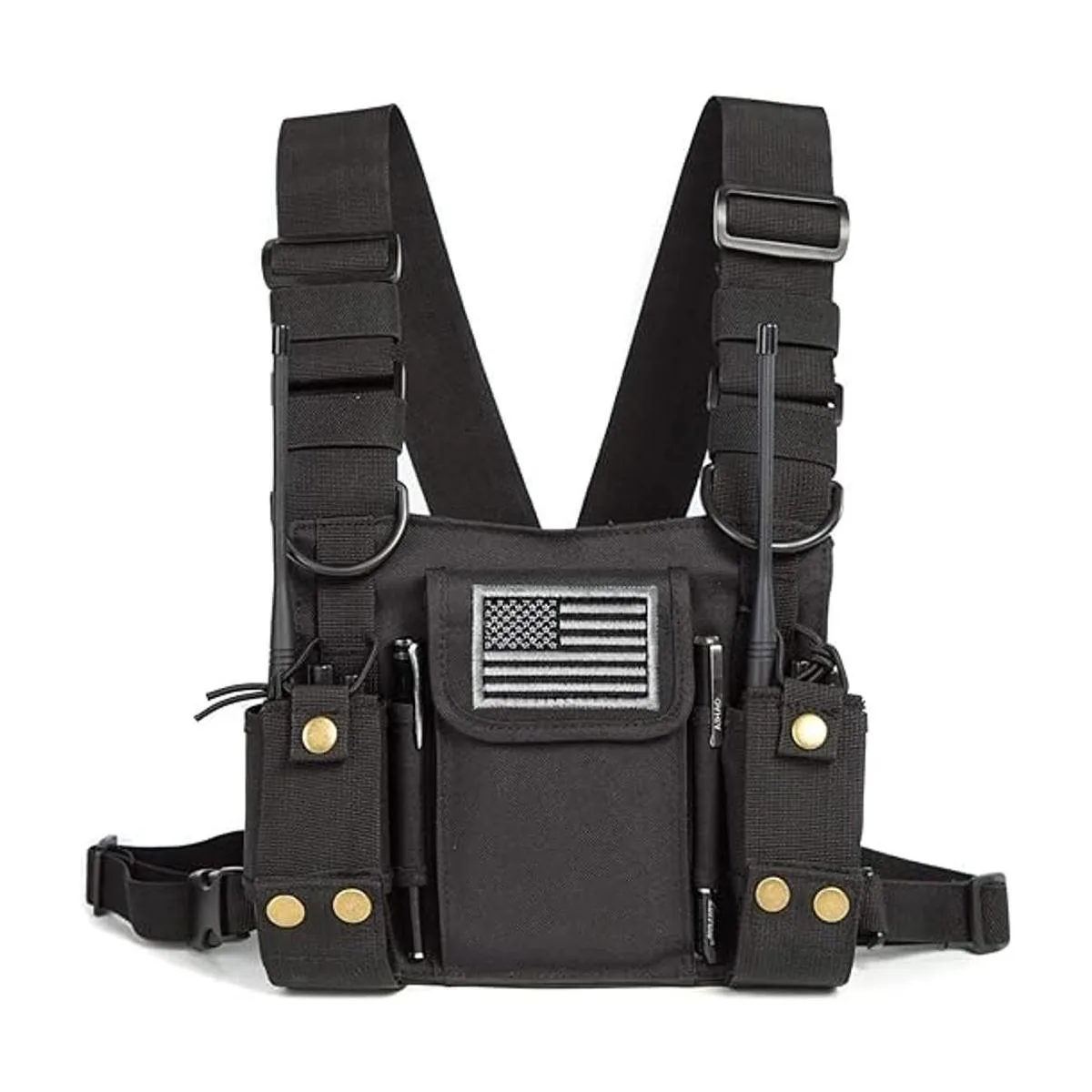 Diseño avanzado: correas de hombro ajustables, adecuadas tanto para hombres como para mujeres. Ambos bolsillos se ajustan en longitud y circunferencia, por lo que puedes poner tu radio principal en ambos lados. La bolsa frontal es buena para las baterías de respaldo, cargador portátil, teléfono, cremallera, etc.