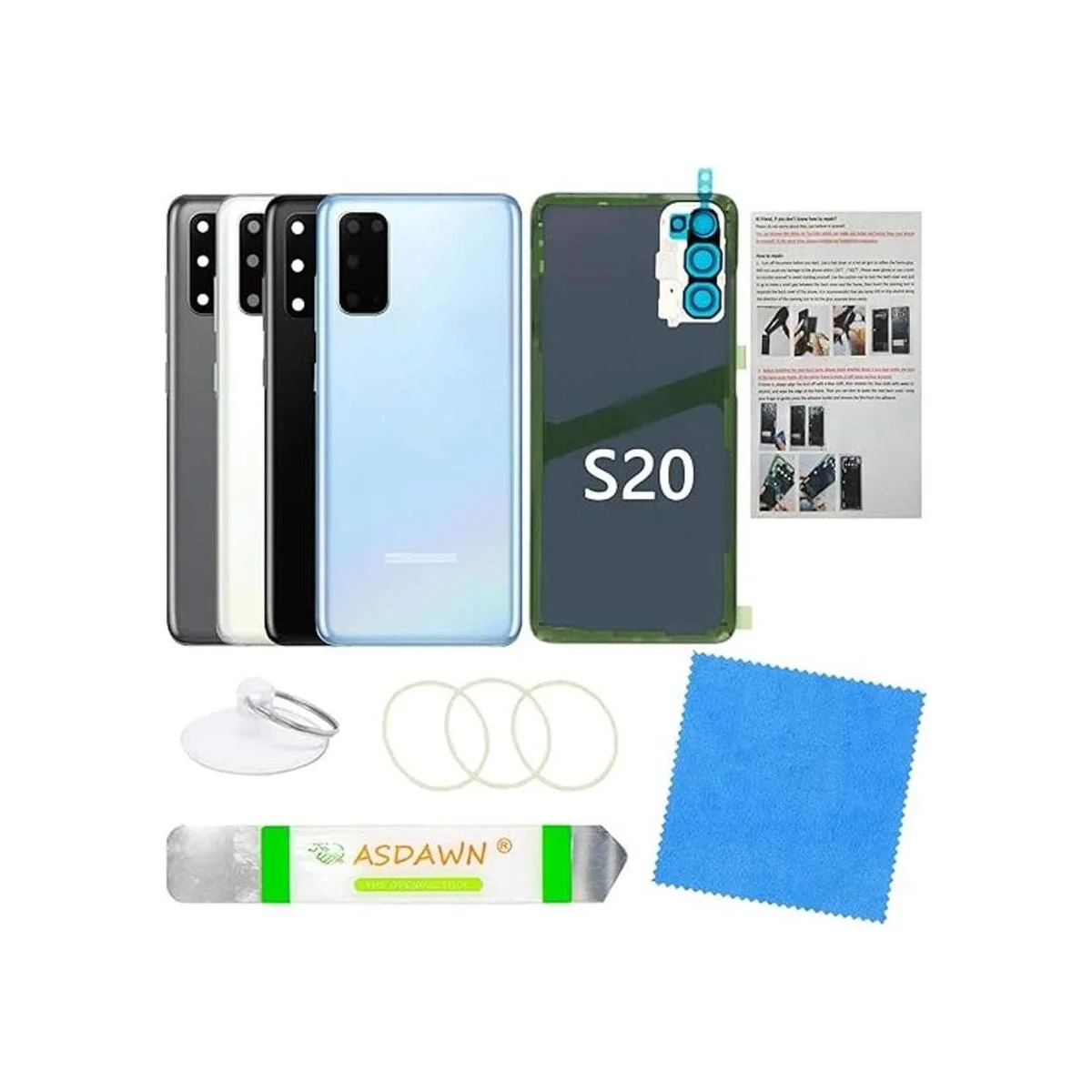 Funda de repuesto para Galaxy S20 con panel trasero de vidrio con manual de instalación lente de cámara preinstalada todo el adhesivo herramientas de reparación para Samsung Galaxy S20 SMG980SMG981 All Carriers azul nube