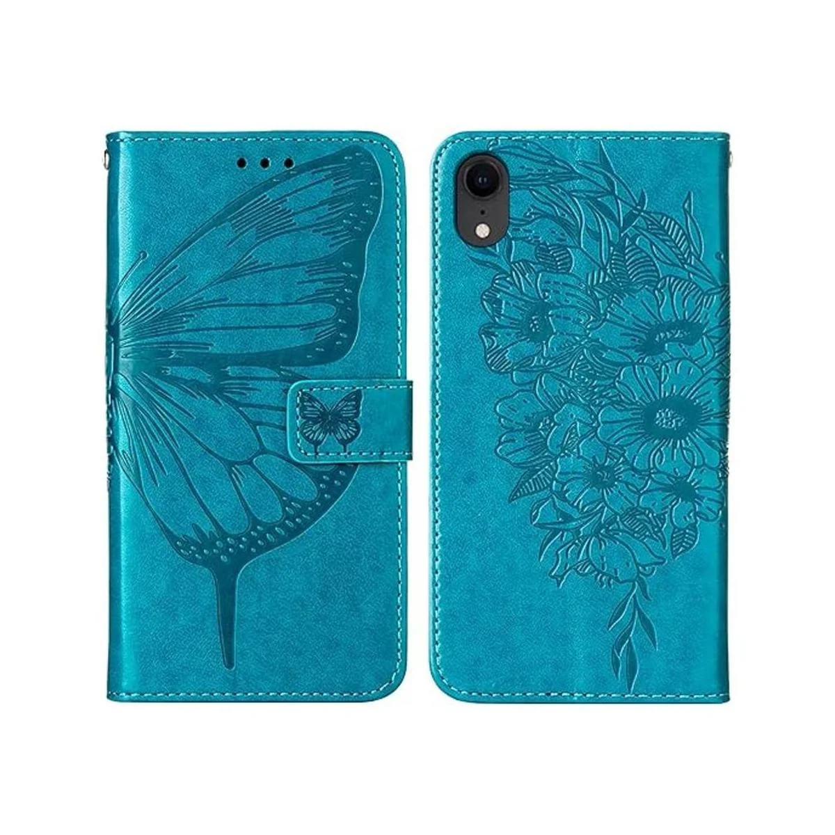 Funda de teléfono para iPhone XR, tarjetero soporte para la muñeca correa de muñeca mariposa floral en relieve para mujer, funda protectora de piel sintética para iPhone XR 2021 azul
