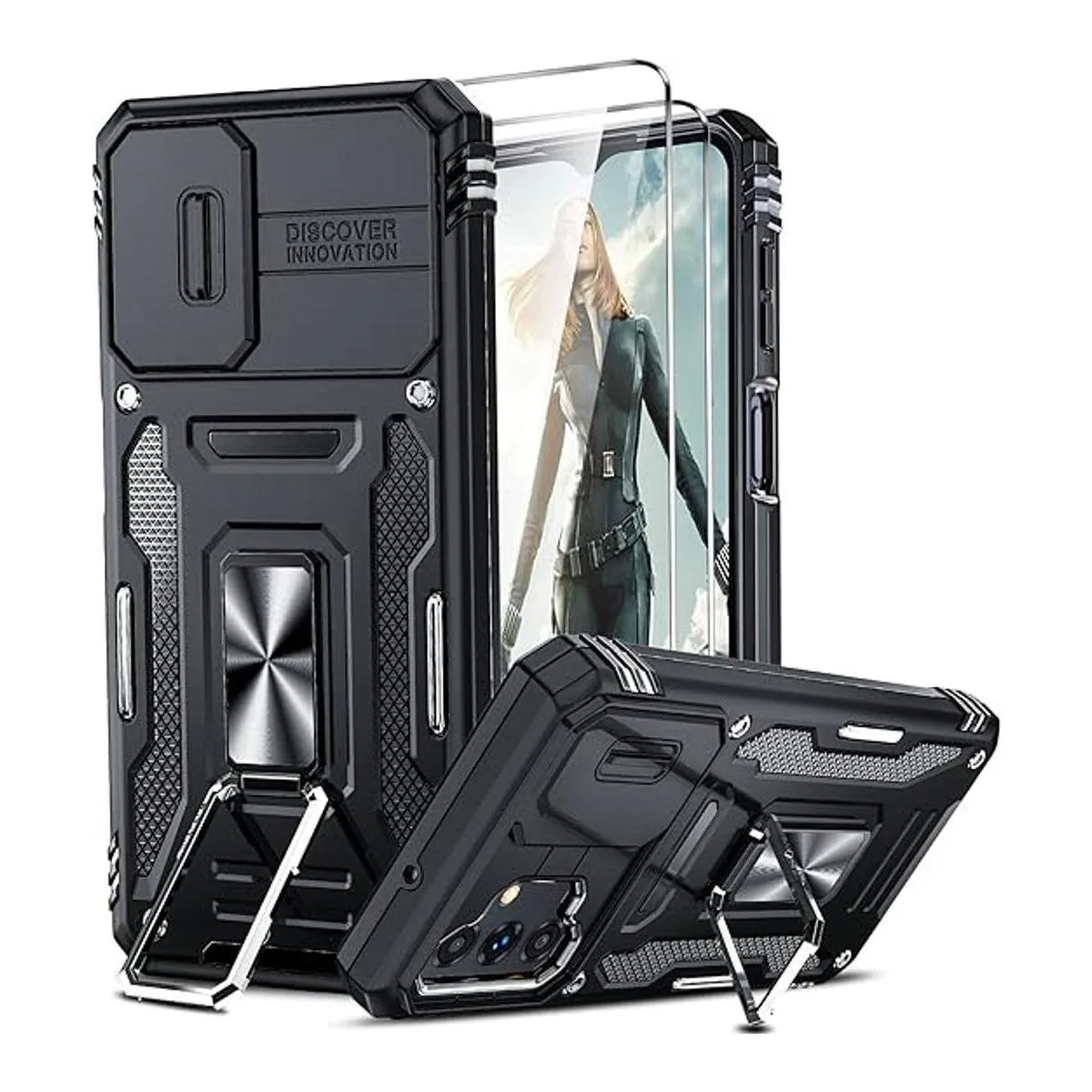 Funda para Galaxy A13 5G, funda para Galaxy A13 5G con cubierta de cámara deslizante 2 paquetes protector de pantalla de vidrio templado, funda para teléfono de cuerpo completo LeYi 360 de grado militar con soporte mejorado para Galaxy A13 5G, color negro