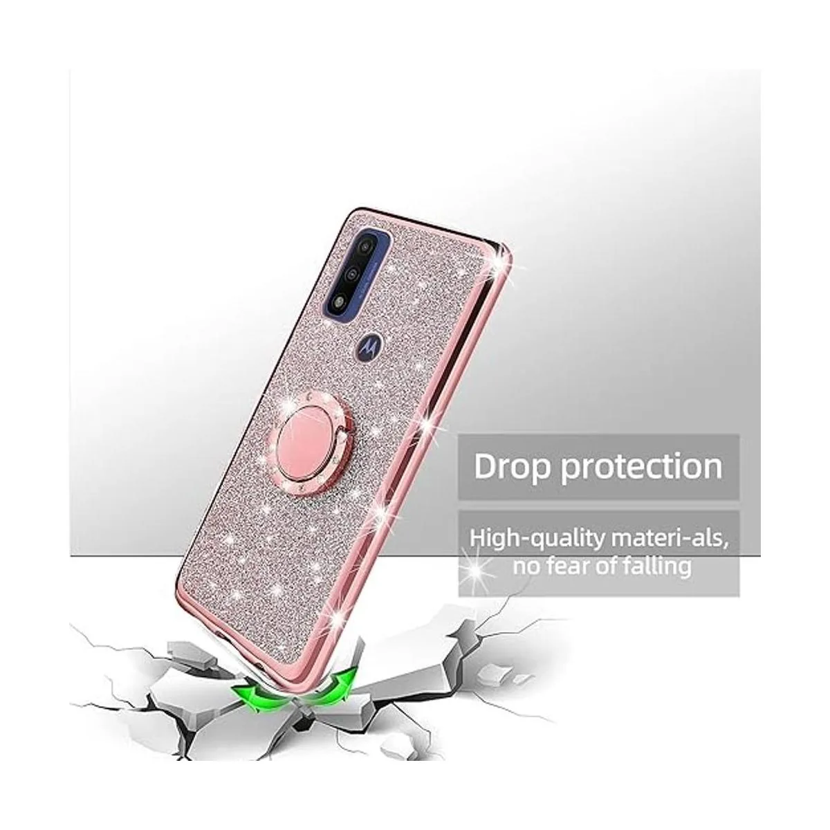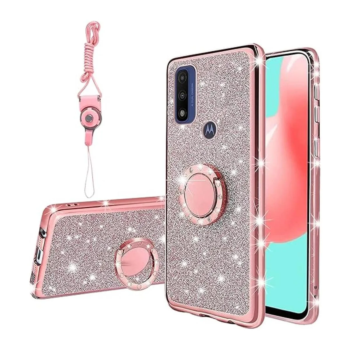 Funda para Moto G Pure 2021, funda para Moto G Power 2022, para niñas y mujeres, con purpurina de lujo, bonita funda delgada de silicona de TPU con soporte de anillo y funda de correa para Motorola GPure 2021, oro rosa