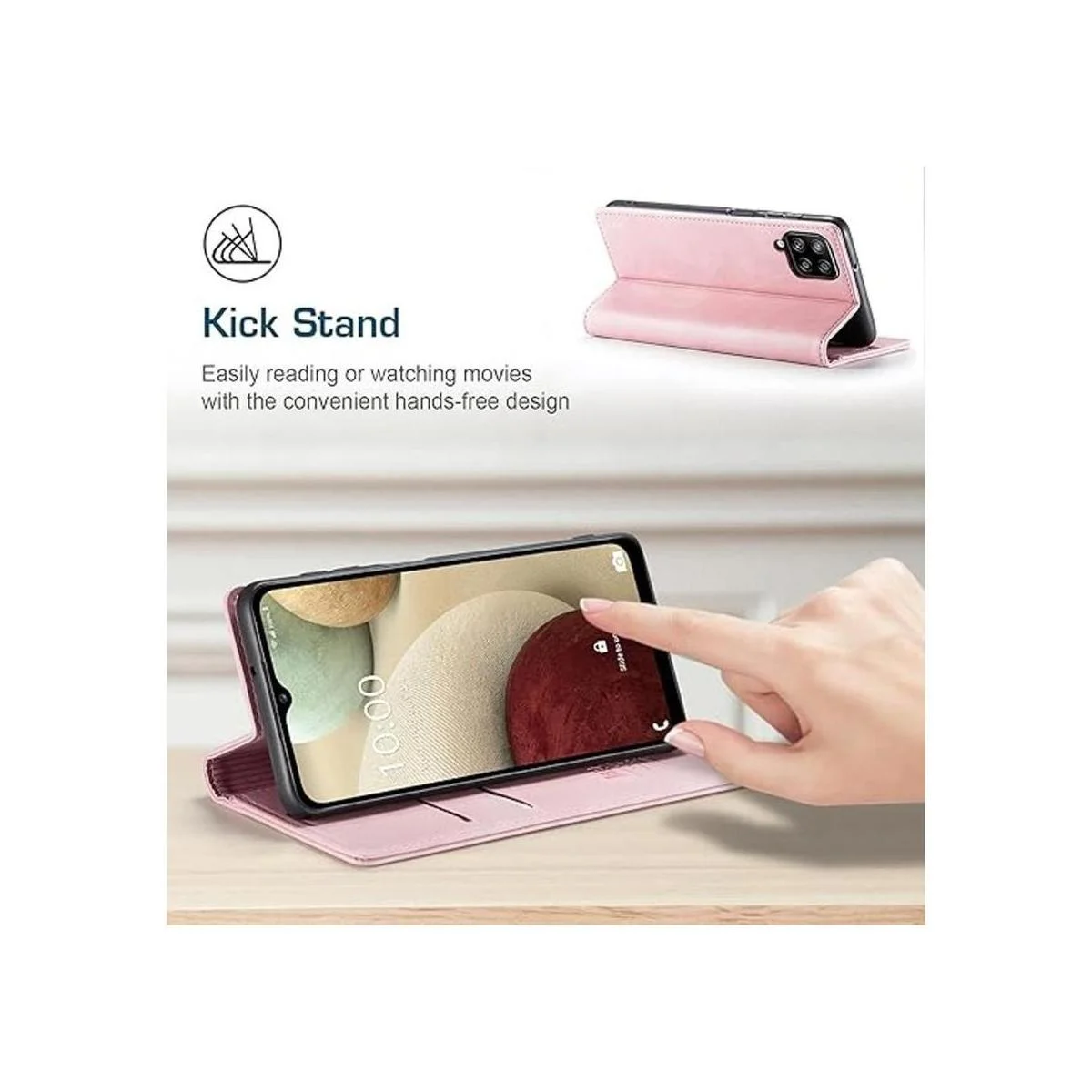 Funda para Samsung Galaxy A12, funda tipo cartera para Samsung Galaxy A12 con soporte para tarjetas bloqueo RFID con función atril magnética, funda con tapa para Samsung Galaxy A12 rosa