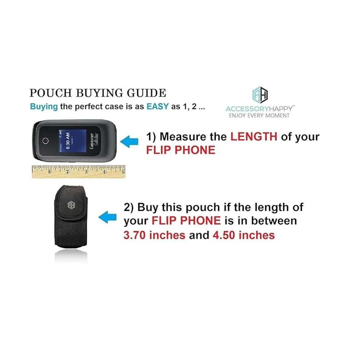 La funda AH se adapta a la mayoría de teléfonos grandes con tapa Dimensiones interiores máximas: 4.5 x 2.3 x 1.1 pulgadas