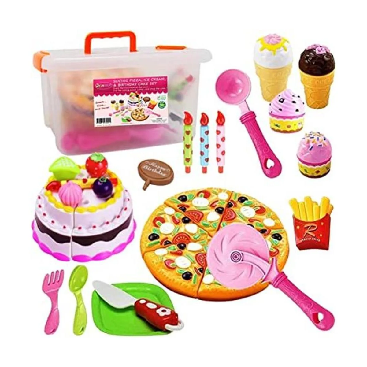 Juego completo de comida: Un juego de alimentos 3 en 1 para niños y niñas, todo almacenado en un hermoso recipiente de plástico. Características: 1. Un bonito juego de tarta de cumpleaños con 4 velas y piezas de decoración para tartas. 2. Un bonito juego de helado con 4 helados y conos. Apila y desapila las bolas de helado. 3. Un pastel de pizza realista cortable y papas fritas. La pizza tiene una cortadora rodante y las rodajas de pizza hacen un divertido sonido crujiente cuando se cortan. A los niños les encanta cortar en pedazos