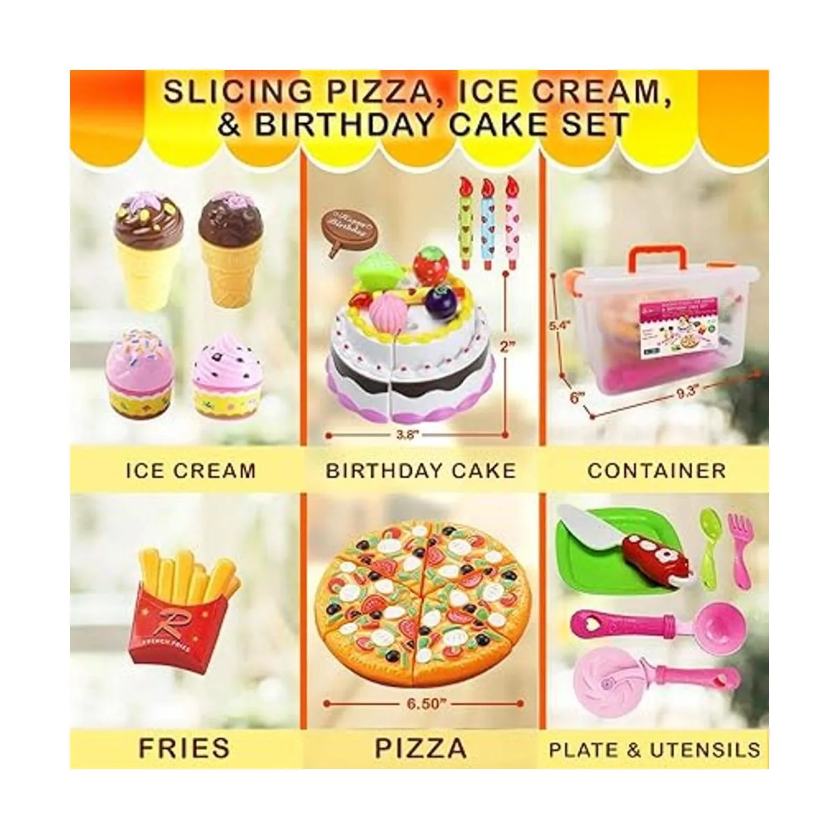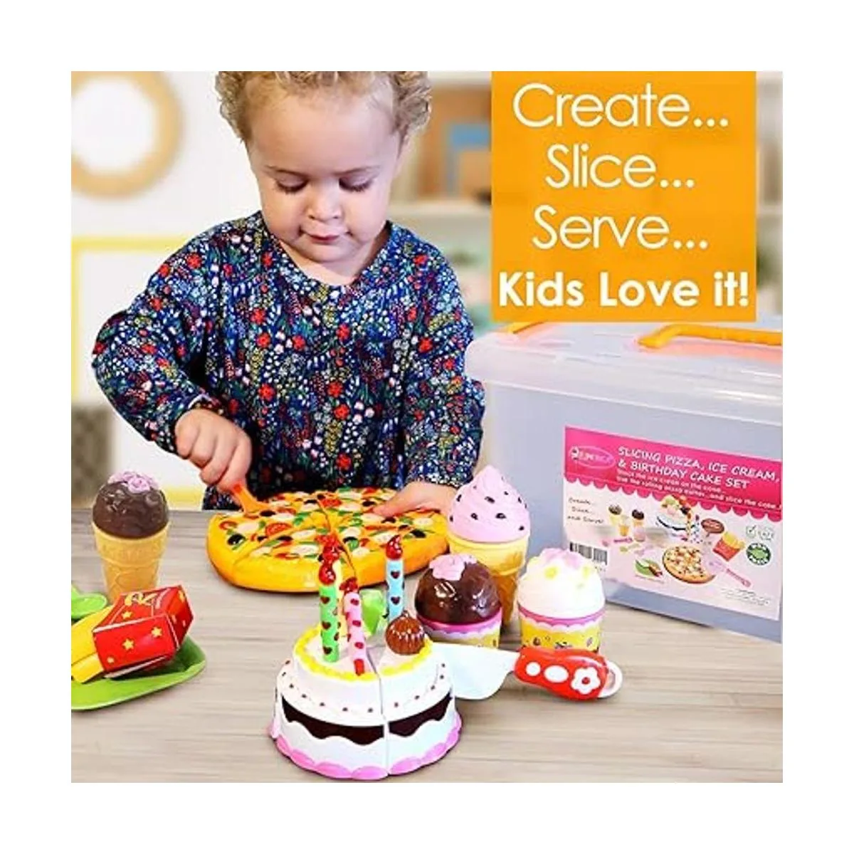 FUNERICA Juego de juguetes para niños con comida para jugar a cortar, con corte de pizza, helado, papas fritas, postre, caja de almacenamiento y pastel de cumpleaños de juguete para celebraciones de fiestas de niños y niñas, para que los niños pequeños aprendan