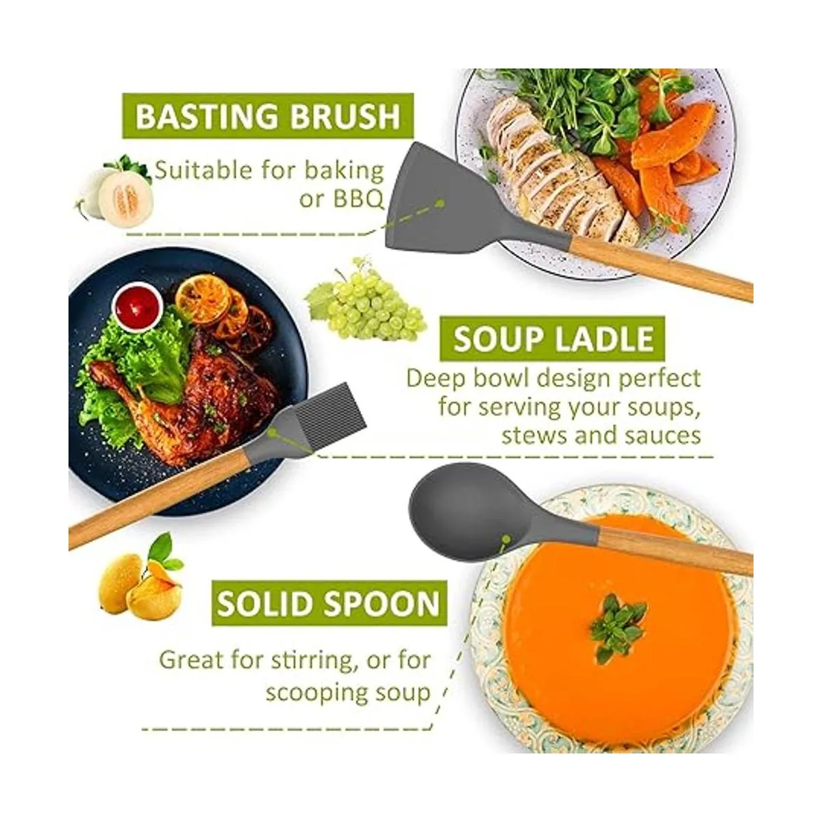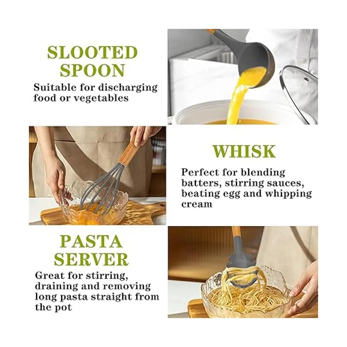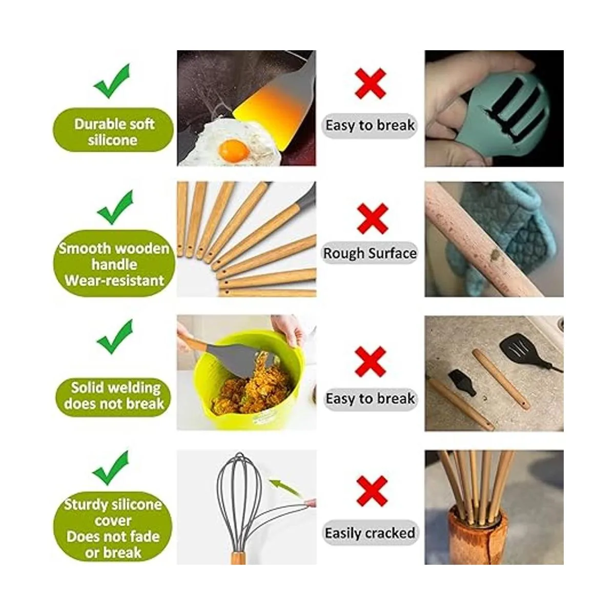 Silicona de grado alimenticio y mango de madera de alta calidad Silicona de grado alimenticio, cabezales de silicona sin BPA que no reaccionan con alimentos o bebidas, ni producen humos peligrosos, no se doblan ni rompen como otros utensilios de cocina de silicona baratos. Las asas de madera dura duraderas tienen un gran aislamiento térmico, protegiendo tus manos de quemaduras garantizan el uso diario durante mucho tiempo sin desgastarse. Diseñado para no doblarse, romperse ni oxidarse