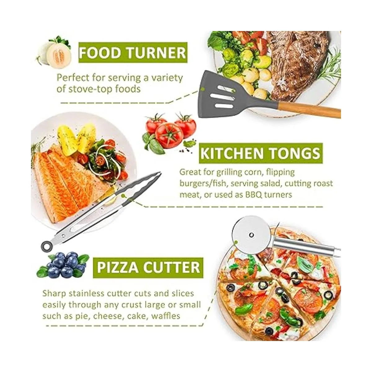 Juego completo de cocina 24 utensilios diferentes para hacer que tu cocina sea mucho interesante y fácil y satisfacer todo tipo de necesidades de cocina, no necesitas gastar una fortuna comprando cada utensilio individualmente. Este juego está diseñado específicamente para ayudarte con todas tus preparaciones de alimentos, como batir, pelar, cortar, agitar, mezclar, hornear, asar, freír y servir ese plato perfecto