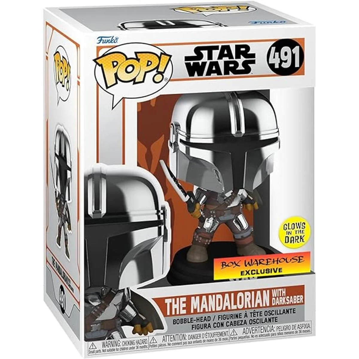 De The Mandalorian, Mandalorian con sable oscuro cromo y brilla en la oscuridad, como un POP estilizado exclusivo de Box Warehouse figura de vinilo de Funko