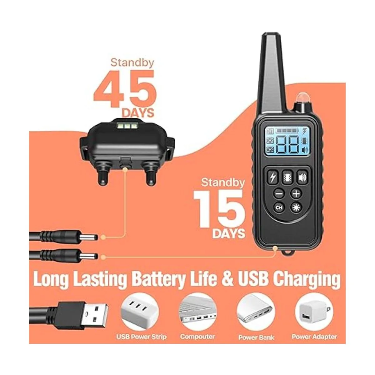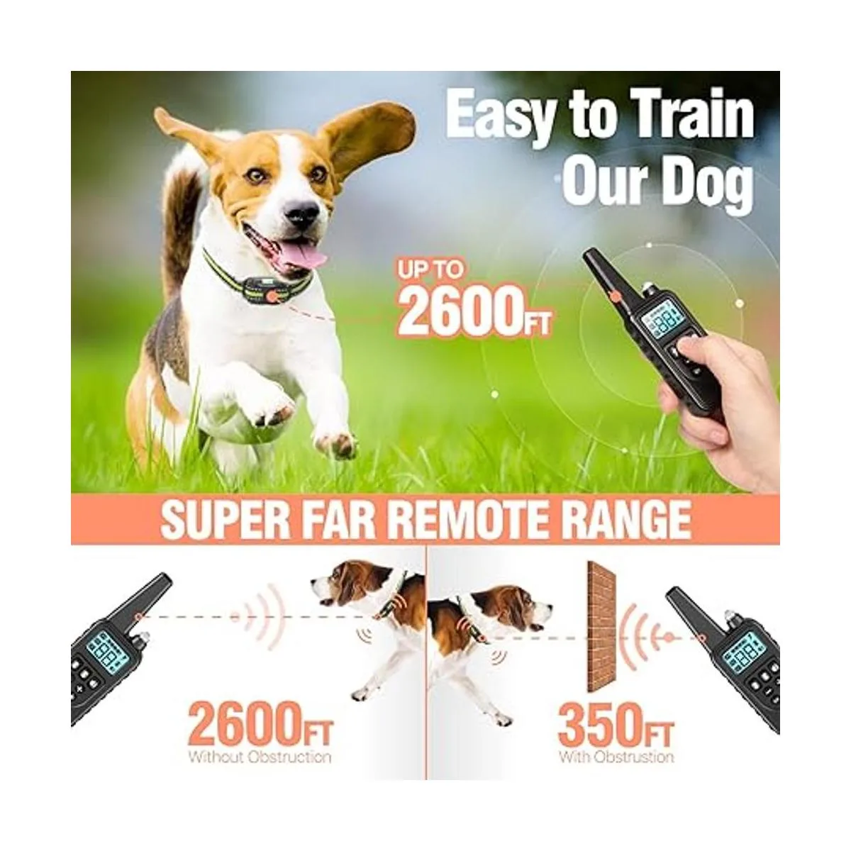 Rango remoto súper lejano de 2600 pies: rango del collar de entrenamiento para perros de hasta 2600 pies 875 yardas, es fácil entrenar a tu perro tanto en el parque como en el patio trasero. Nunca te preocupes de que corra demasiado lejos con collares de choque para perros con control remoto