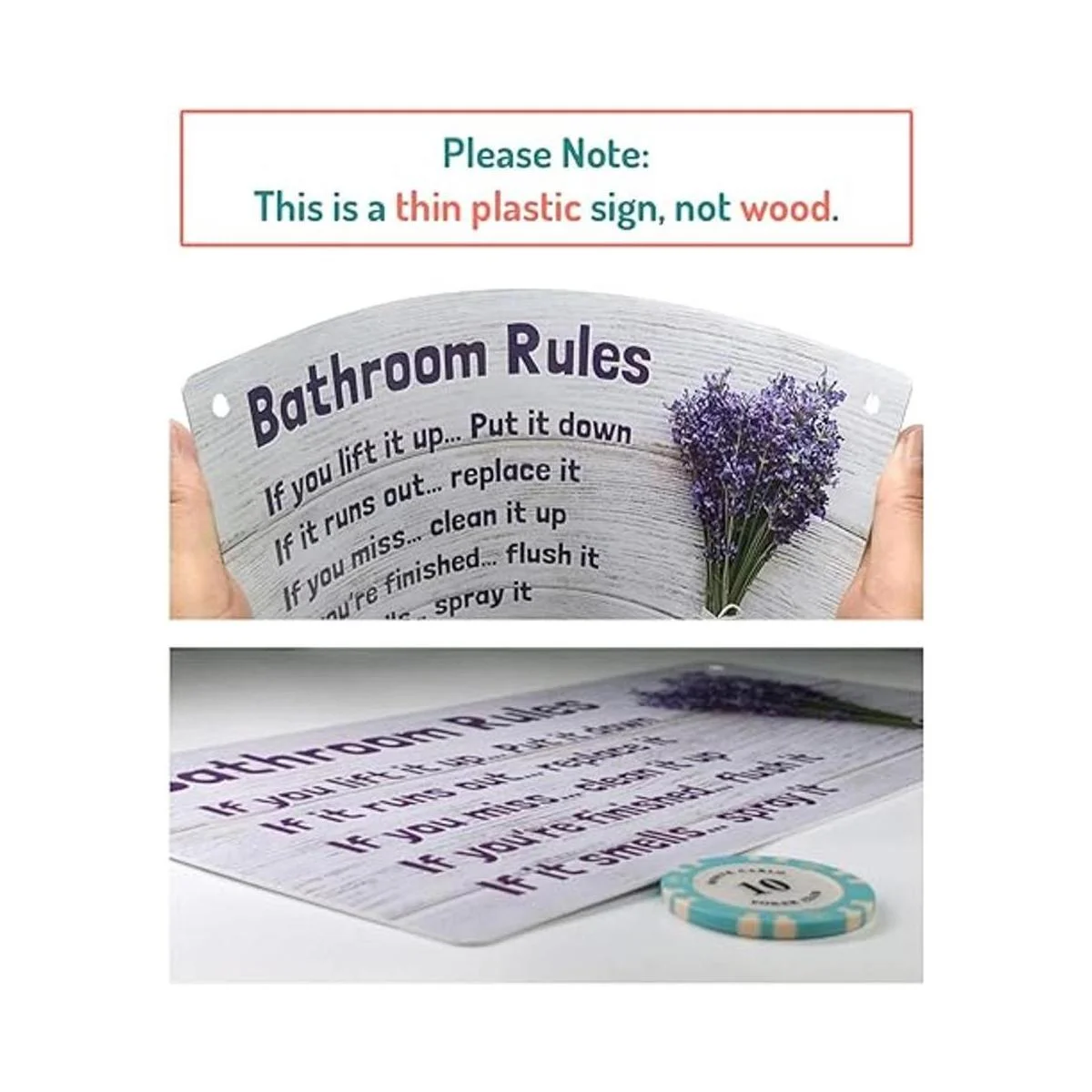 FunPlus Decoración de baño de lavanda, letrero colgante de plástico de PVC de 12 x 6 pulgadas, impresión de alta precisión, a prueba de agua y humedad, reglas de baño, accesorios de baño morados, lavanda