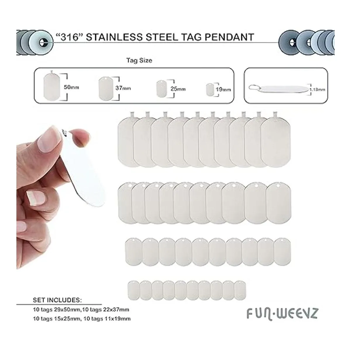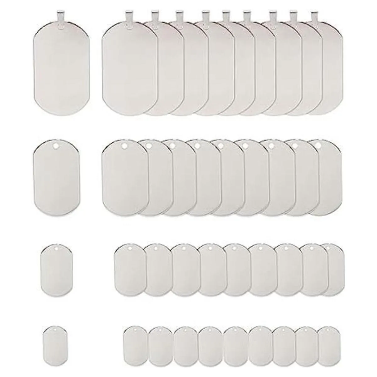 FunWeevz 40 colgantes en blanco para etiqueta de perro, 316 etiquetas de sublimación de acero inoxidable, 4 tamaños de escudo grabado, dije de identificación militar de metal brillante para hacer joyas y adultos