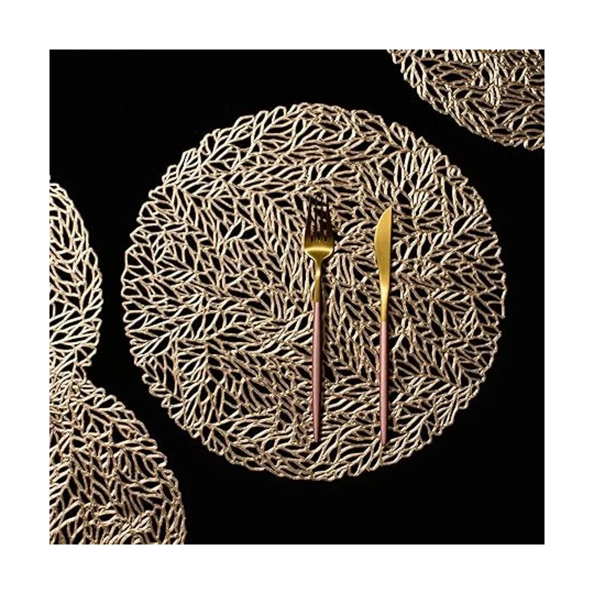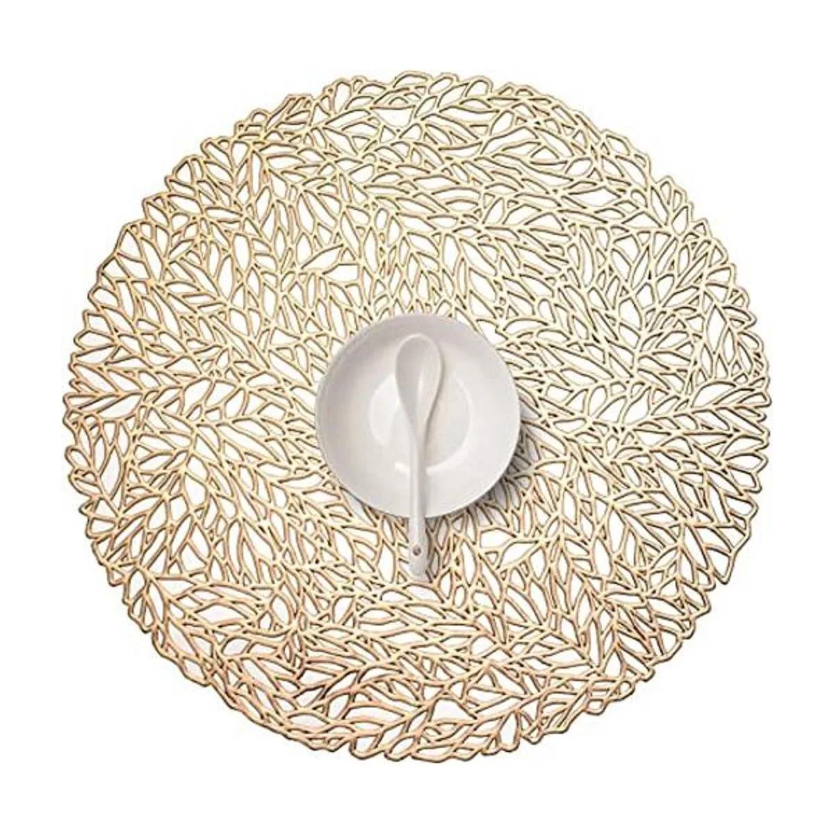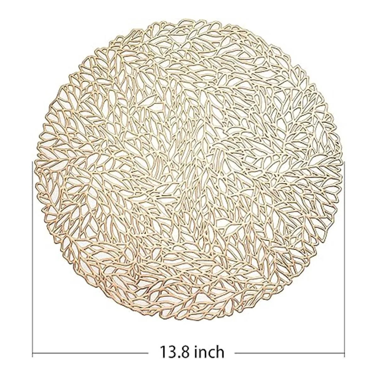 FunWheat Juego de 6 manteles individuales redondos de vinilo metálico dorado de 13.8 pulgadas, manteles individuales huecos, resistentes al calor, brillantes, regalo decorativo para cumpleaños, bodas dorado coral
