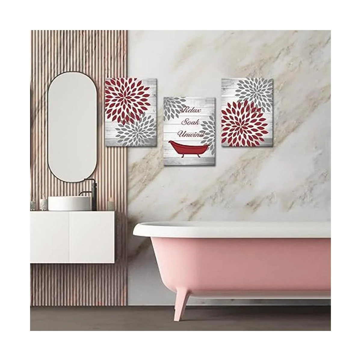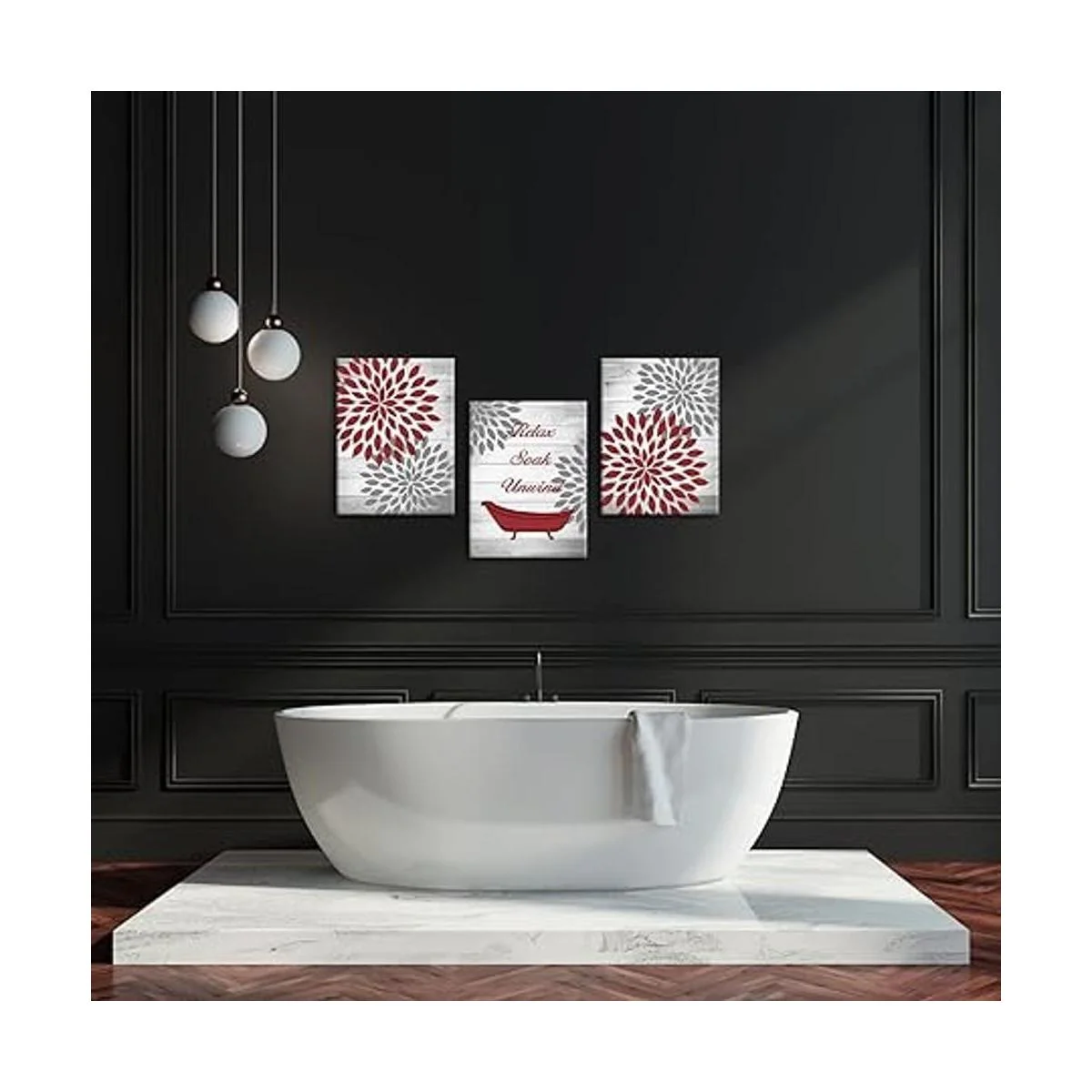 Fushvre Relax Soak Unwind Print 3 piezas Vintage Dalia Flor y Bañera Póster Lienzo Decoración Rojo Gris Floral con Fondo de Madera Pintura Arte Impresiones Enmarcado para Baño