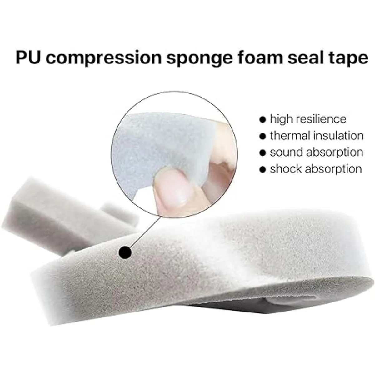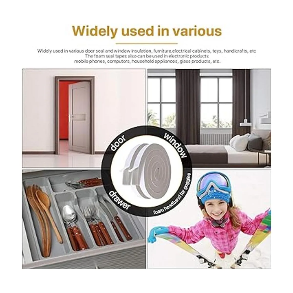 Tira de espuma ampliamente utilizada La cinta de espuma es ampliamente utilizada en varios sellos de puertas y aislamiento de ventanas, como materiales de absorción de sonido, material de sellado y aislamiento para aire acondicionado o refrigeradores, materiales de absorción de impactos utilizados en automoción, electrónica, dispositivos de audio, gafas de esquí, diadema de espuma para protector facial, etc