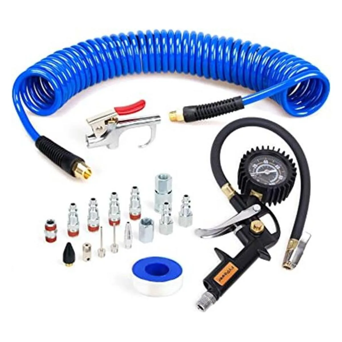 Kit de herramientas de compresor de aire avanzado: este juego de accesorios de compresor de 18 piezas incluye una manguera de aire de poliéster de retroceso de 25 pies, medidor de inflador de neumáticos de 100 PSI, boquillas de de soplado resistentes, acopladores, agujas de inflado y mucho más.