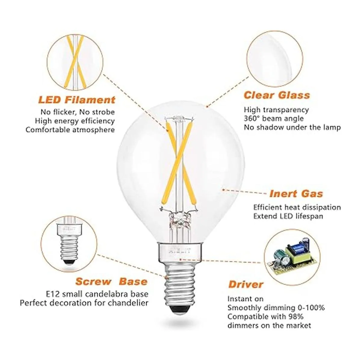 MODERN DISIGN No flicker, high CRIcolor rendering index, AIELIT E12 globe light bulb features a classic filament design for an oldfashioned appearance that evokes the feel of an original Edisonstyle bulb. The warm white2700K antique style led Edison bulb with a romantic light white glow is perfect for lanterns or exposedbulb lighting applications