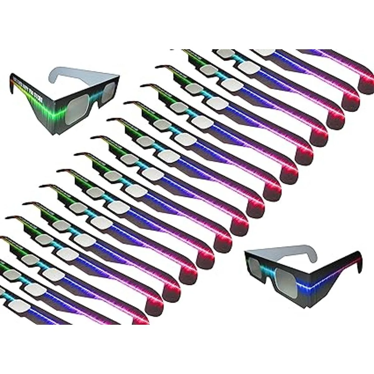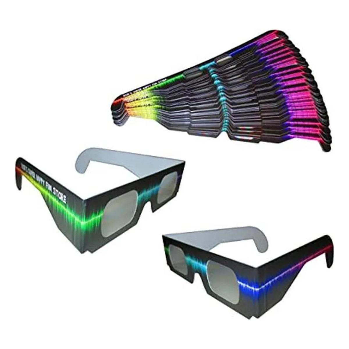También conocidos como regalos de fiesta de caleidoscopio, gafas de difracción, gafas de fuegos artificiales, gafas de espectáculo de fuegos artificiales, gafas de luz de vacaciones y Navidad, gafas de onda ligera, clase de ciencia, gafas de festival, gafas de rave, gafas láser, gafas de guante LED, gafas de espectáculo de luz órbita, gafas de prisma