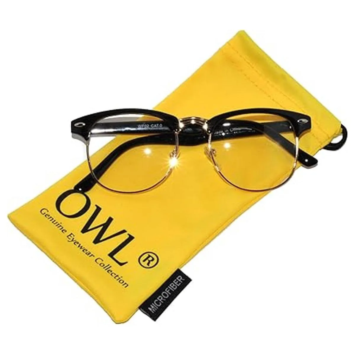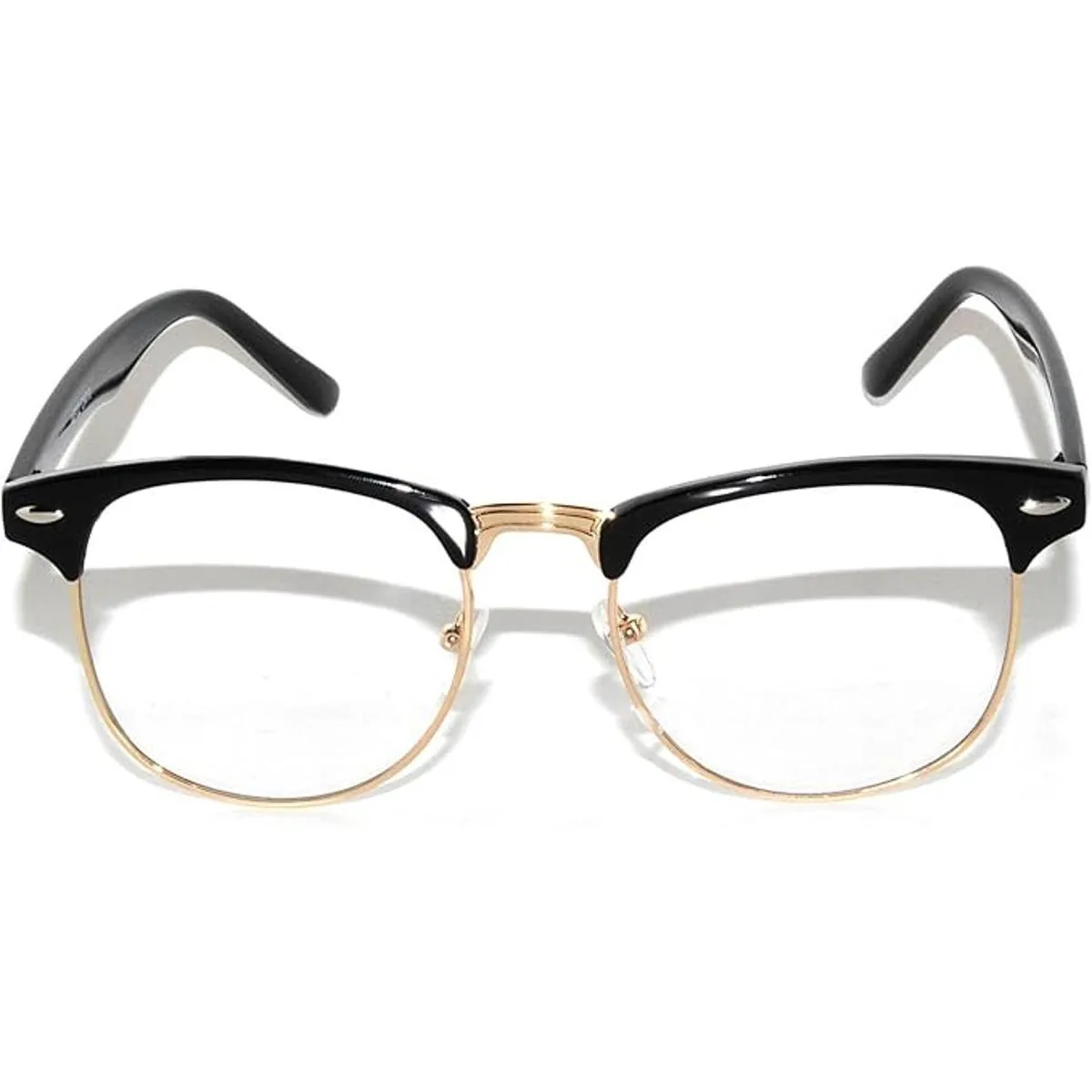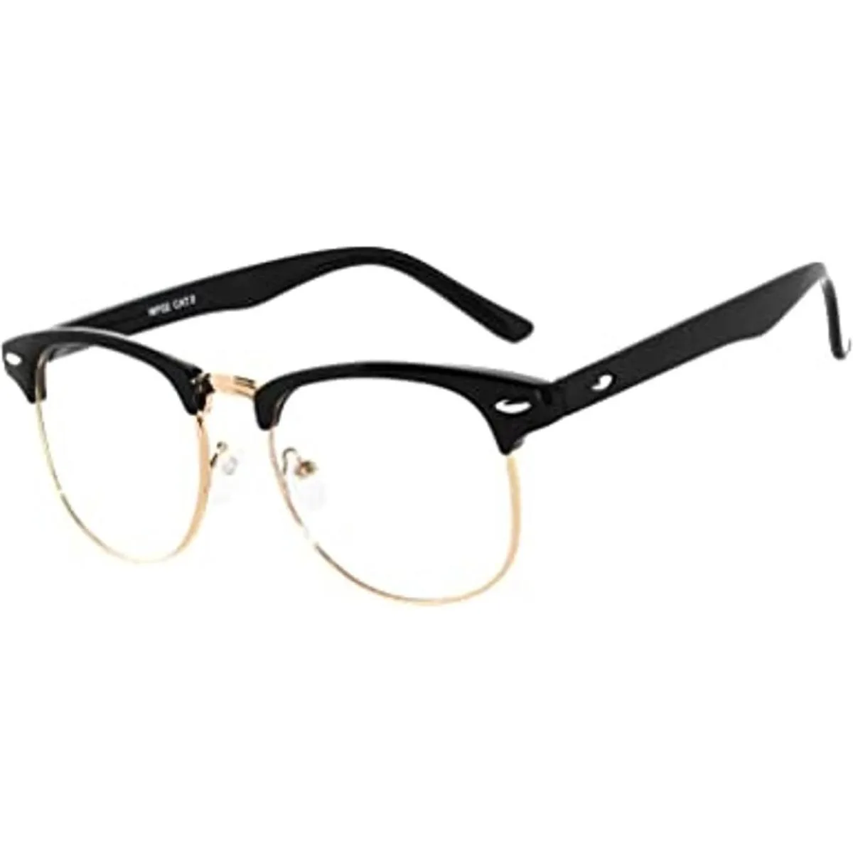 Gafas de sol de estilo clásico con lentes transparentes de color negro y dorado con medio marco. Gafas de sol enumeradas por OnlineWelcome. 100 garantía de imagen y gafas coinciden.