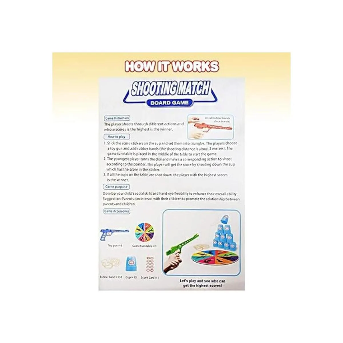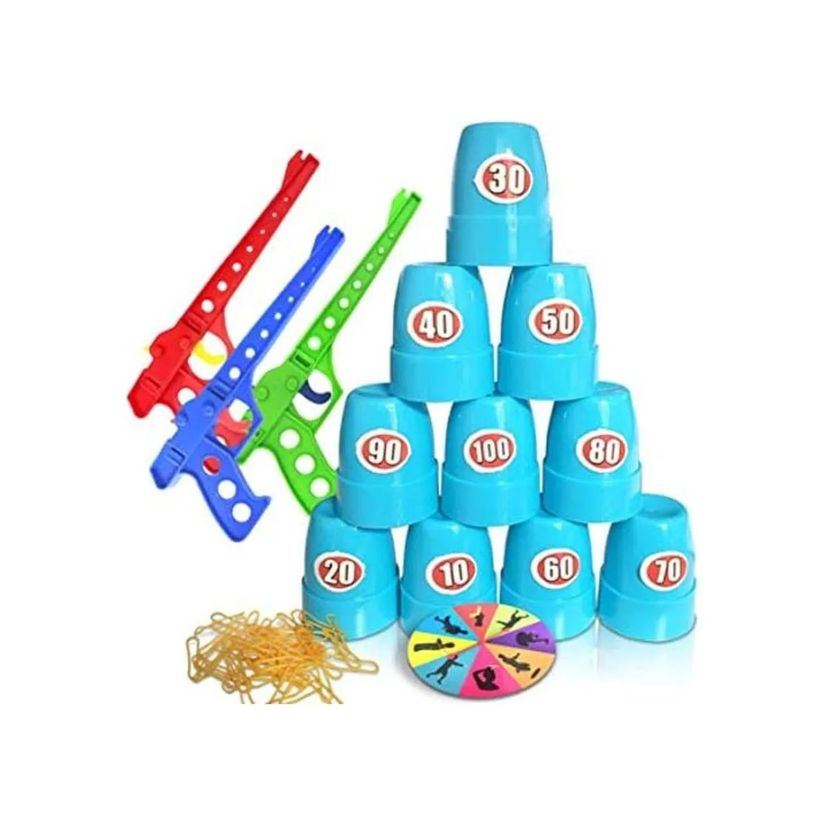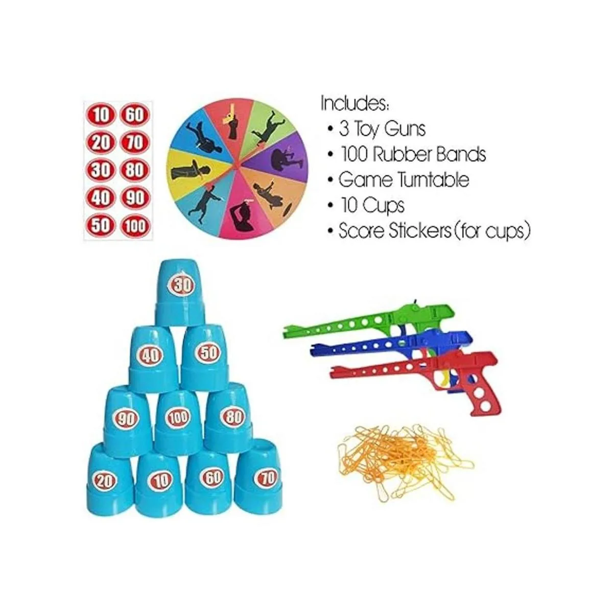Gamie Juego de competición de disparos para niños Incluye 3 pistolas de juguete, 100 bandas de goma, 10 tazas, tocadiscos de juego, pegatinas de puntuación e instrucciones Divertido juego de práctica de objetivo para niños y niñas