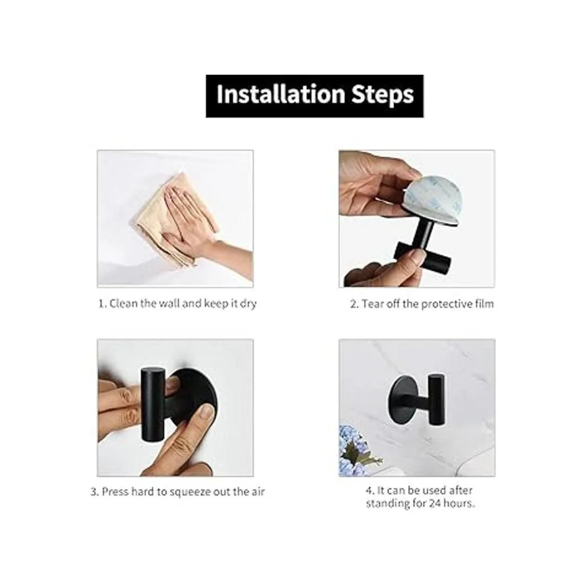 Fácil de instalar: no hay necesidad de taladrar, simplemente retira la película protectora en la parte posterior del gancho y presiona para pegar en la pared. Antes de usar los ganchos para toallas, mantén la superficie de la pared limpia, seca y lisa. Lo mejor es esperar 24 horas para garantizar una mejor adherencia de los ganchos de pared.